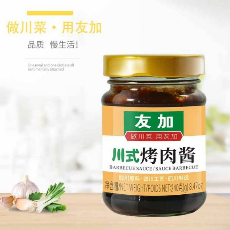 友加川式烤肉酱,优选多种原料炒制而成,调料齐全,外出烧烤只携带一瓶友加川式烤肉酱即可。