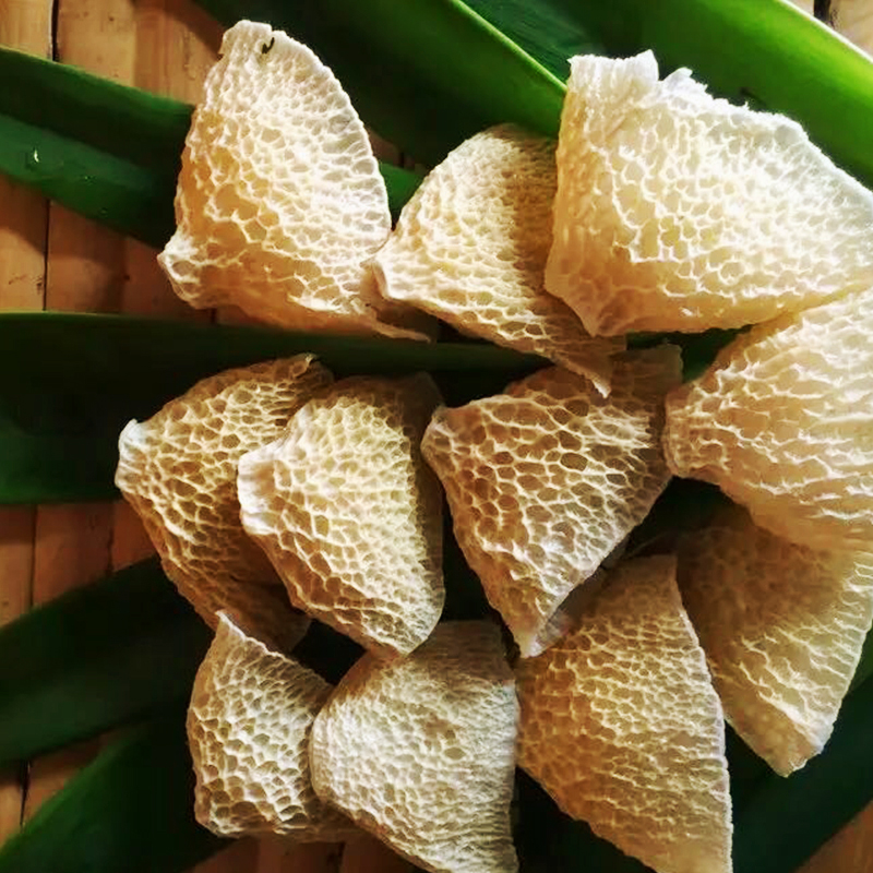 竹毛肚,即竹荪盖。平时常见的竹荪(包括菌柄和丝网状的盖),上面还有一个像钟罩一样的菌帽,颜色发绿,表面有凹凸不平的网格,形似牛毛肚,因此被称为“竹毛肚”。主产于四川宜宾,口感脆爽,鲜香味美,是不可多得的素食佳肴。