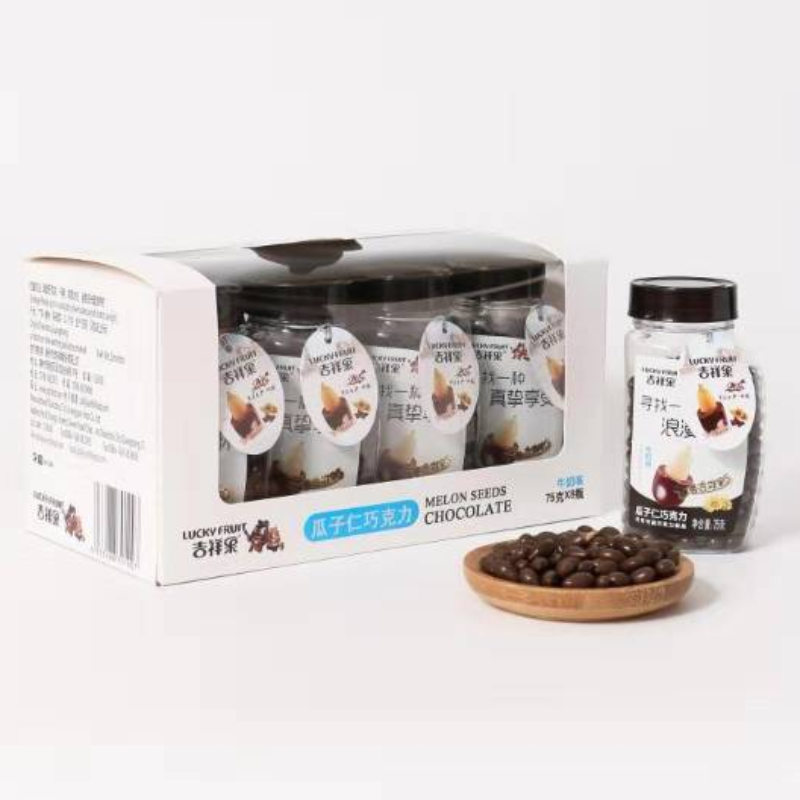 75克瓶装瓜子仁巧克力为盒装产品,选用新鲜的瓜子仁为原料,层层浓郁巧克力浆包裹,再配上香甜的脆皮,让您体验完美的口感,随带随吃,是您旅游,送礼的佳品!