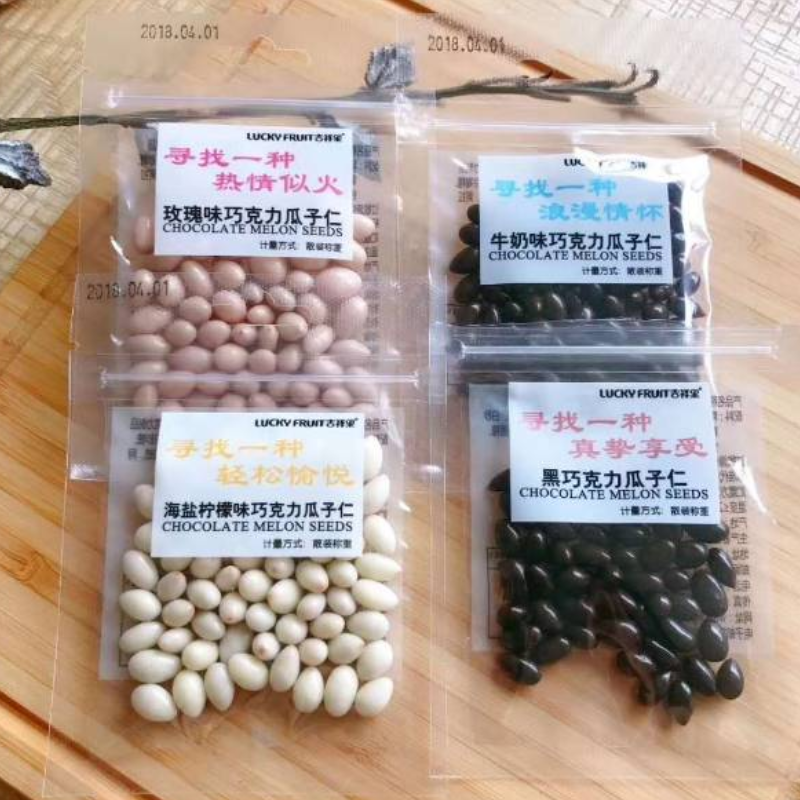 瓜子仁巧克力散称系列共有4个单品,分别是牛奶味瓜子仁巧克力、海盐柠檬味瓜子仁巧克力、玫瑰味瓜子仁巧克力、醇黑瓜子仁巧克力,产品选用新鲜的葵花籽仁为原料,层层浓郁巧克力浆包裹,再配上香甜的脆皮,让您体验完美的口感,随带随吃,是您旅游,送礼的佳品!