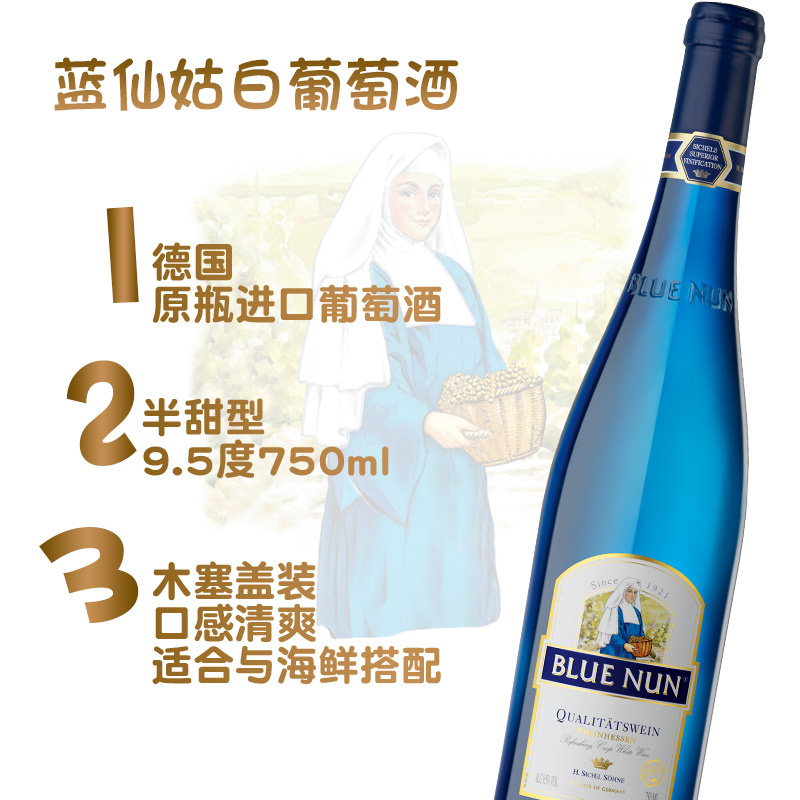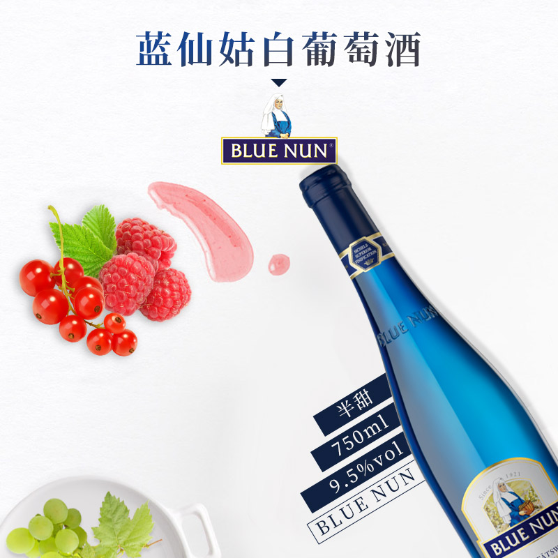 德国蓝仙姑白葡萄酒,采用蓝色酒瓶包装,取自莱茵黑森产区的葡萄酿制而成。该酒细腻可爱,冰镇后饮用,甜度适中,酒味有如鲜花般清香,可搭配海鲜、肉类等东方美食。