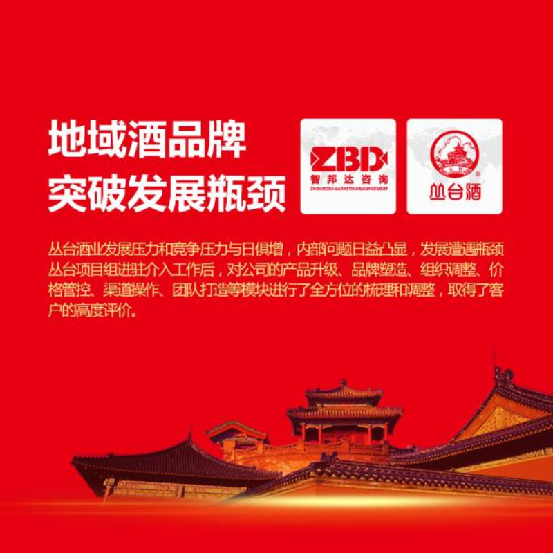 丛台酒业发展压力和竞争压力与日俱增,内部问题日益凸显,发展遭遇瓶颈。丛台项目组进驻介入工作后,对公司的产品升级、品牌塑造、组织调整、价格管控、渠道操作、团队打造等模块进行了***的梳理和调整,取得了客户的高度评价。