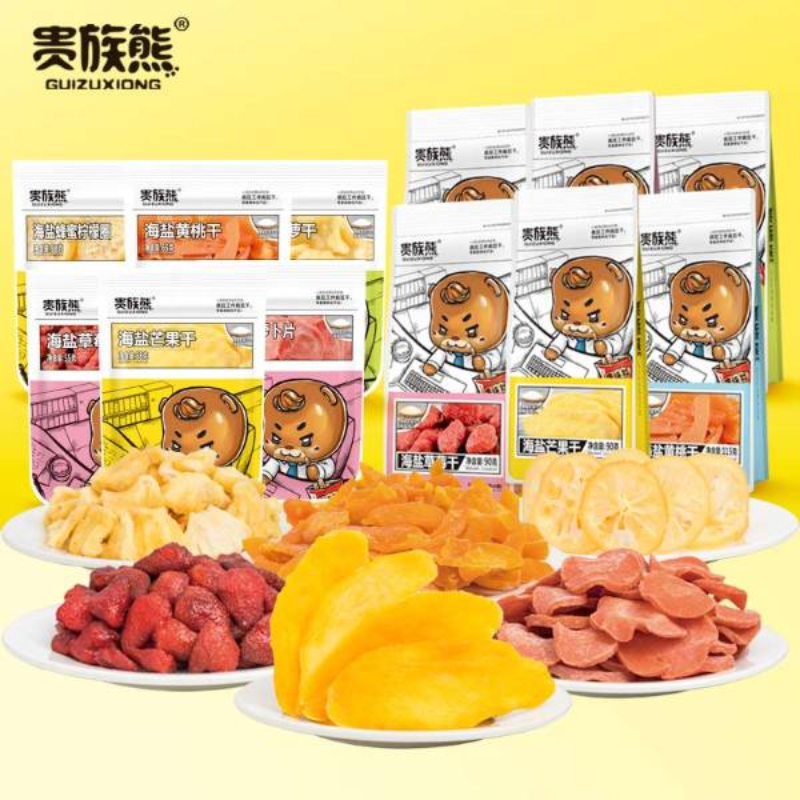 产品:90g海盐芒果干、90g海盐草莓干、115g海盐黄桃干、115g海盐菠萝干、115g海盐蜂蜜柠檬圈、158g海盐红萝卜片