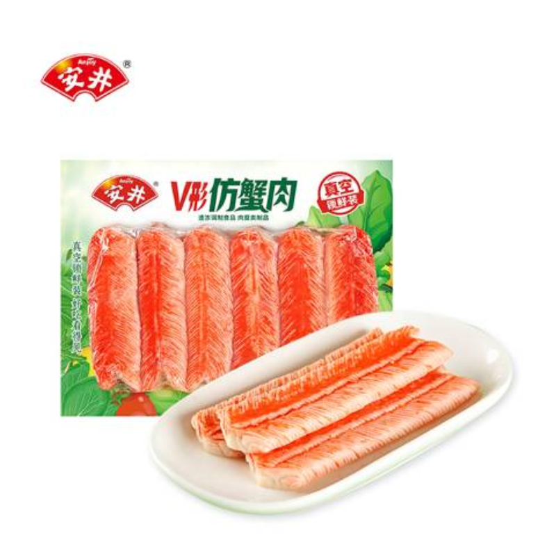 模拟蟹腿肉的质感和风味,肉质结实有韧性,口感咸中带甜,极具仿真效果
