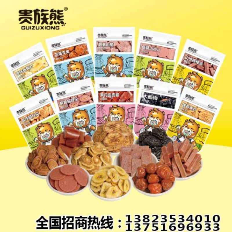 产品:68g蓝莓李果、50g大西梅、78g山楂棒棒条、88g果丹皮皮卷、78g桑葚山楂片、78g酵素山楂、78g原味猫耳朵、78g紫薯猫耳朵、55g原味香蕉片、50g烤香蕉片