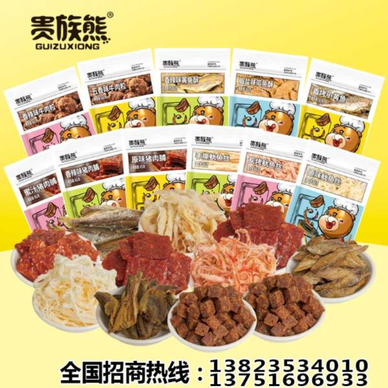 产品:45g原味猪肉脯、45g蜜汁猪肉脯、45g香辣猪肉脯、50g原味鱿鱼丝、50g炭烤鱿鱼丝、50g手撕鱿鱼丝、68g香辣味牛肉粒、68g五香味牛肉粒、40g香辣黄鱼酥、40g盐焗带鱼酥、50g烤香小黄鱼