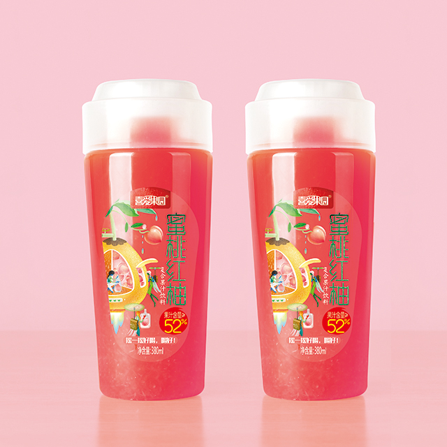喜爱果园杯装果肉果汁,产品果汁含量52%,果肉添加量3%