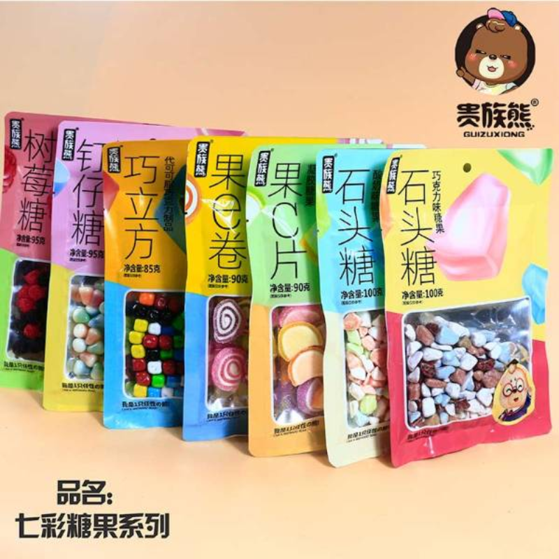 产品:95g钉仔型软糖、85g巧立方、95g树莓型软糖、100g石头糖(巧克力味)、100g石头糖(酸奶味)、90g果e卷、90g果c片、100g熊仔杯