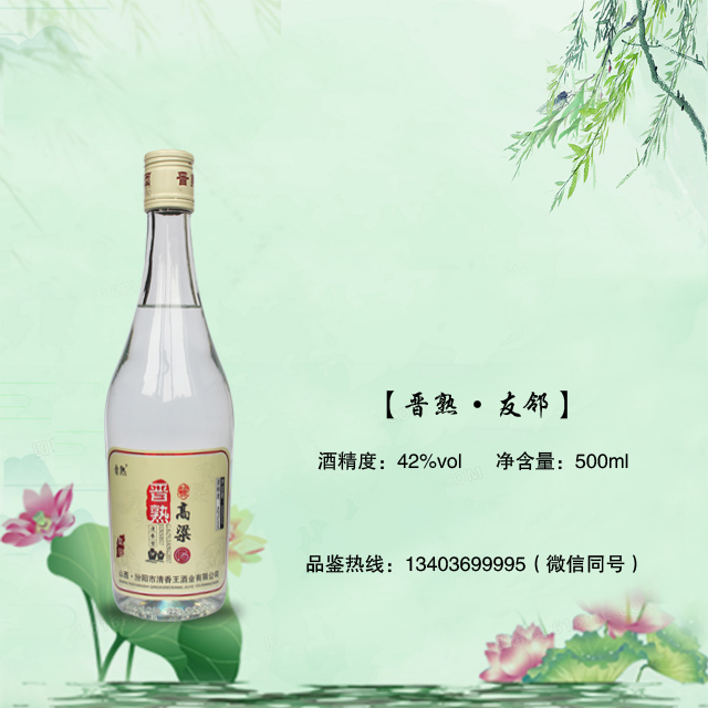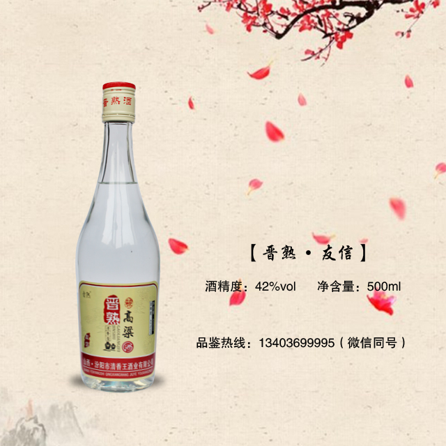 晋熟高粱酒采用优质高粱为酿造原料,经陈年老窖发酵,长年陈酿,经过一整套科学、独特、完整、严谨的浸泡蒸煮、糖化发酵、蒸馏贮存的工艺酿制而成,具有酒体晶莹醇厚,香气悠久,味醇厚,口感清香绵长,各味谐调,恰到好处,酒味**的独特风格。