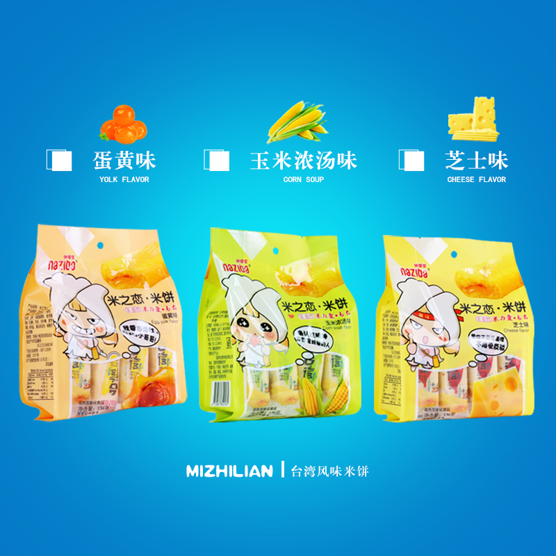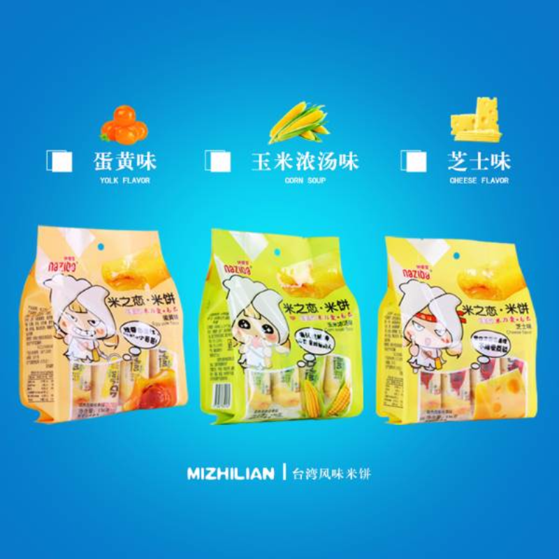 米之恋米饼,一袋内有16个小包装,一共四个口味,芝士味、玉米浓汤味、蛋黄味、豆乳味