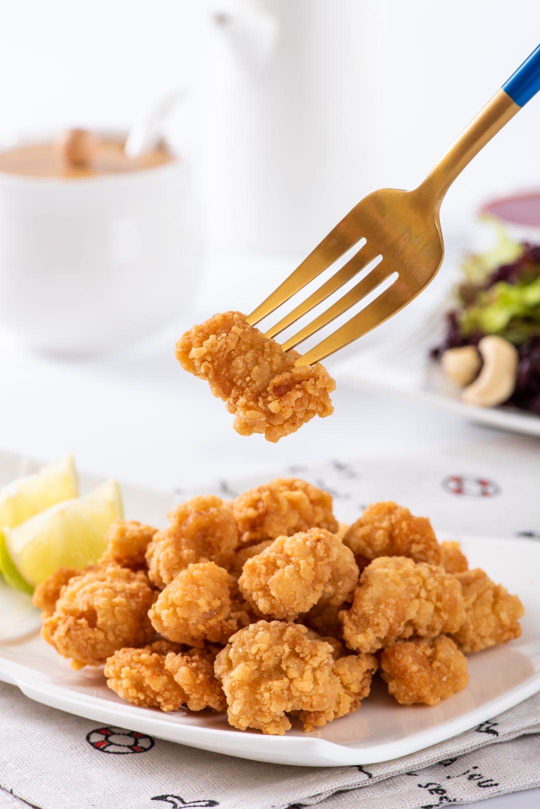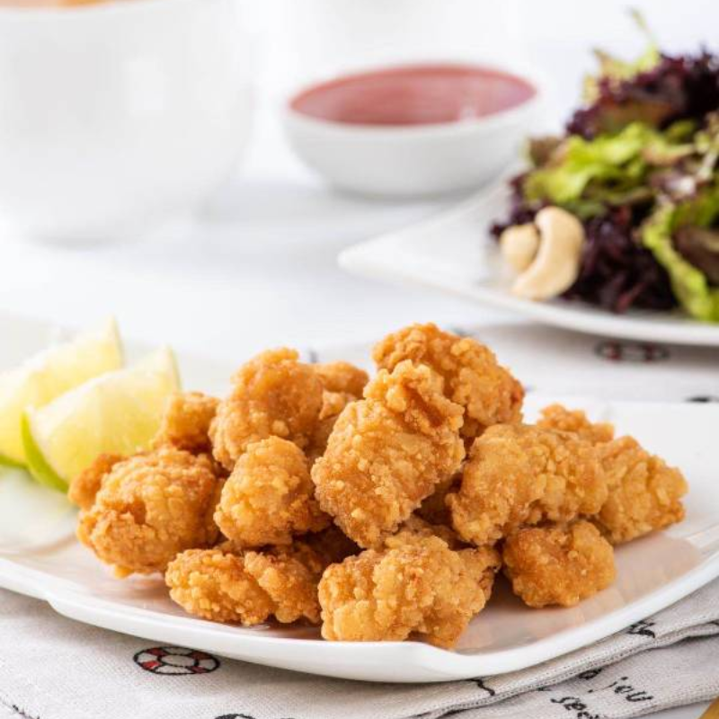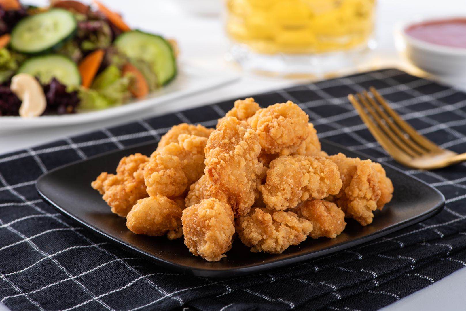 精选鸡胸肉切丁,肉块大,精心调配腌料和裹粉,味道鲜美,口感酥脆爽口,肉质细嫩多汁,外酥里嫩,成品色泽雪白,炸后金黄美观。