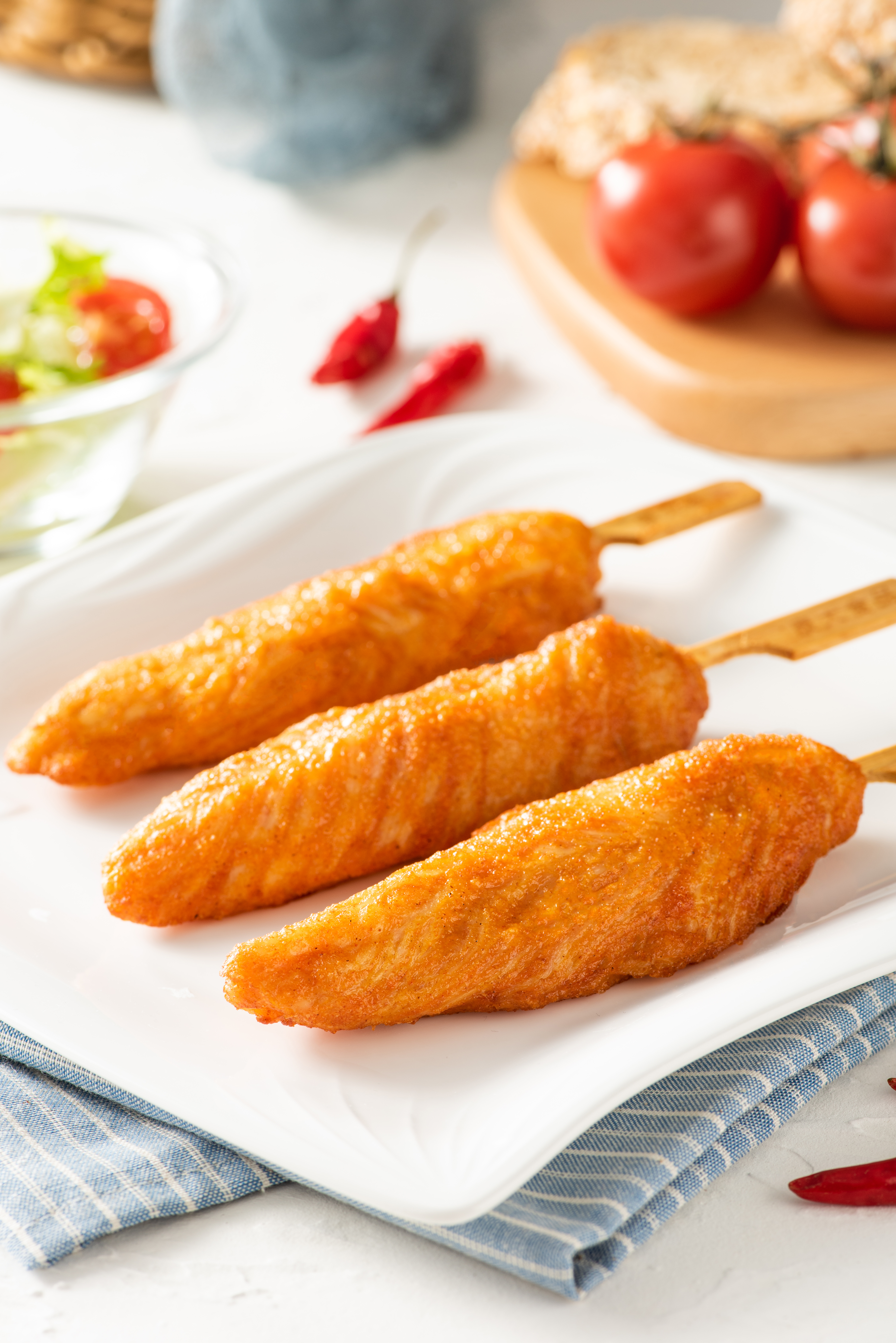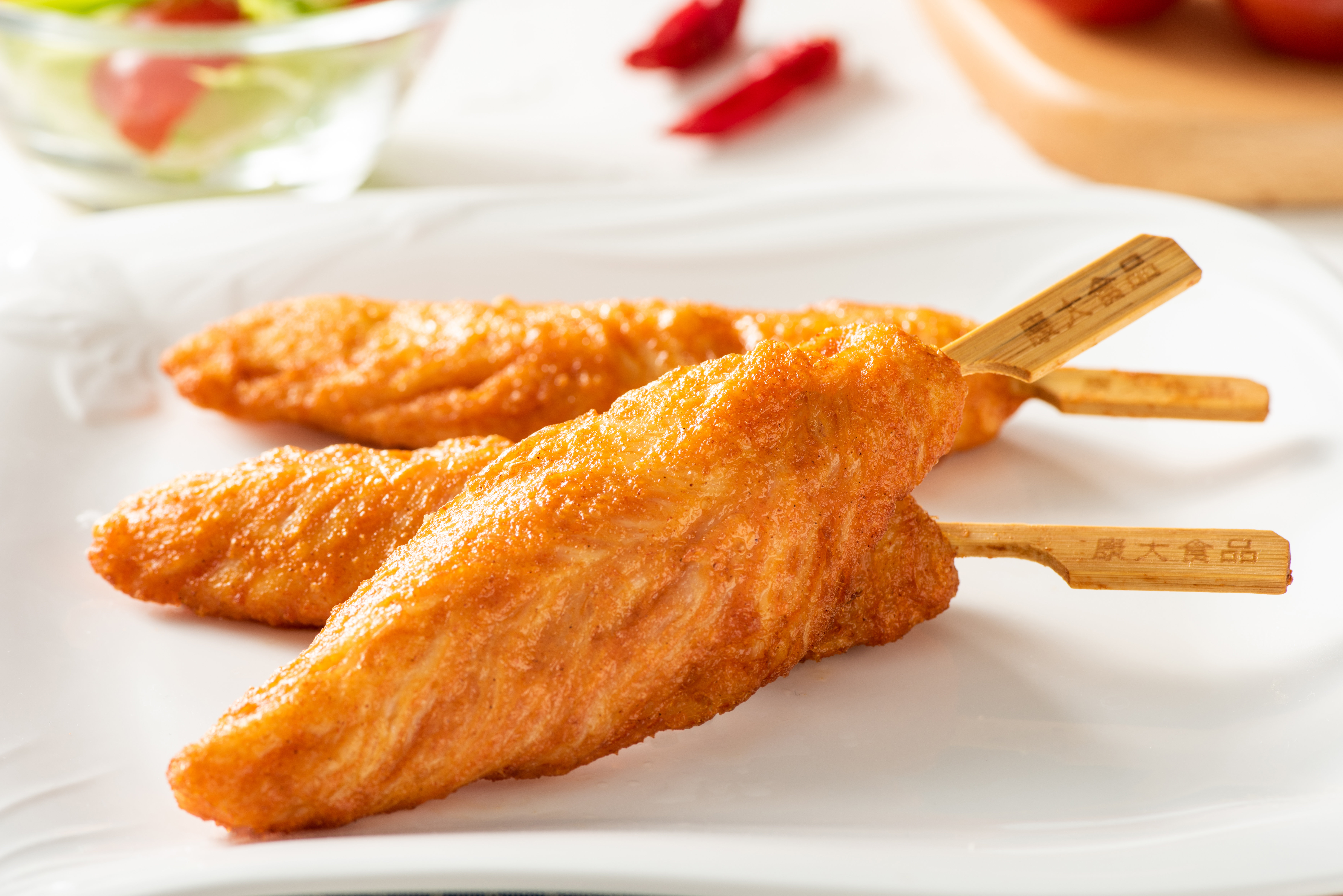 选用优质鸡胸肉,经腌制调味,穿签加工,色泽美观,形状佳,肉感鲜嫩,肉丝爽滑!