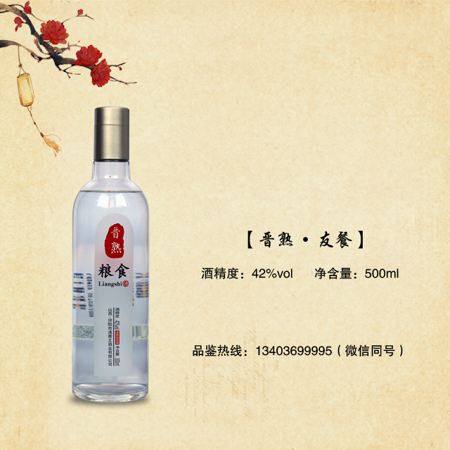 晋熟高粱酒采用优质高粱为酿造原料,经陈年老窖发酵,长年陈酿,经过一整套科学、独特、完整、严谨的浸泡蒸煮、糖化发酵、蒸馏贮存的工艺酿制而成,具有酒体晶莹醇厚,香气悠久,味醇厚,口感清香绵长,各味谐调,恰到好处,酒味**的独特风格。