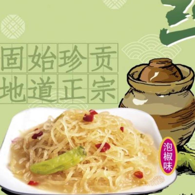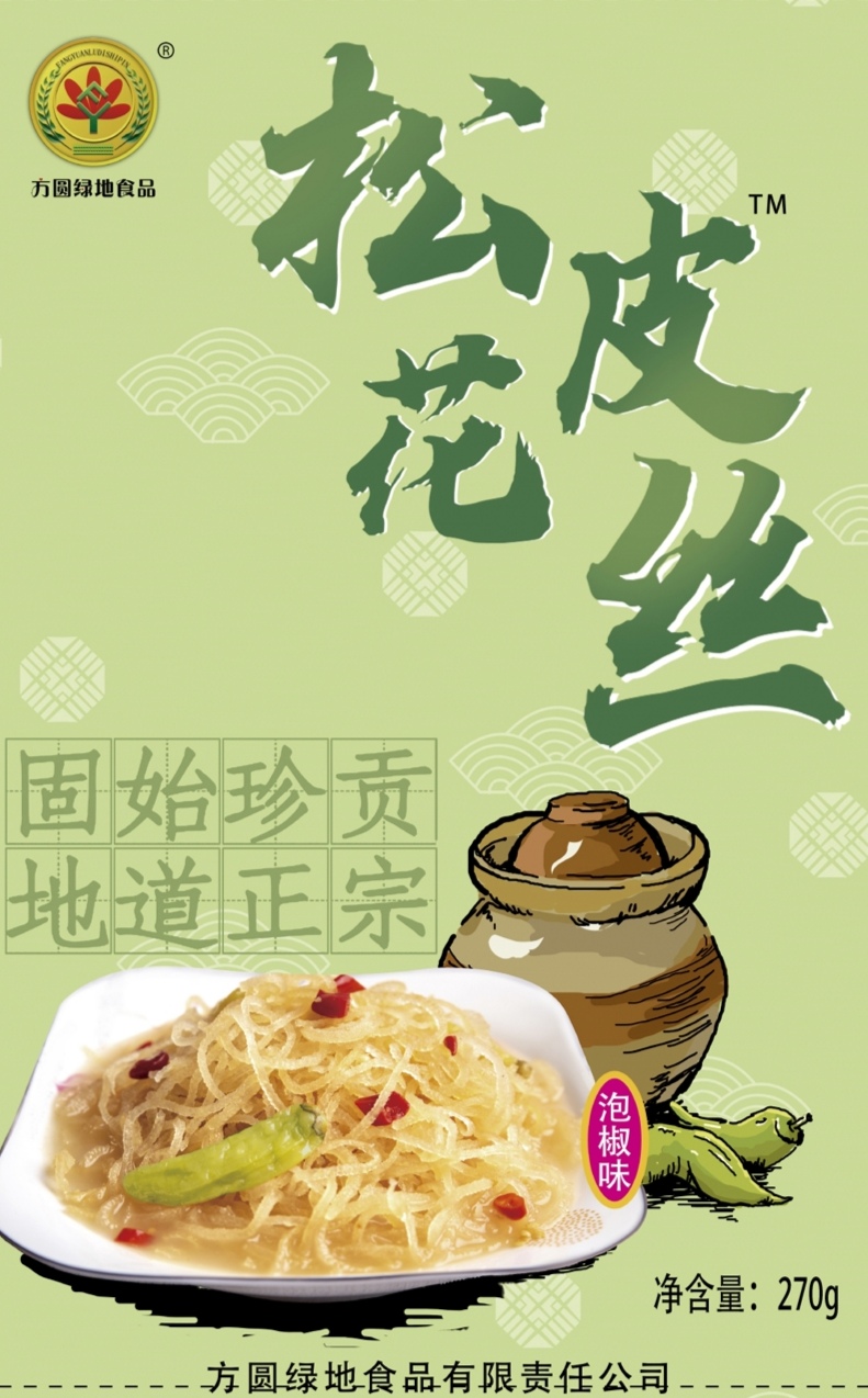 松花皮丝(泡椒味)开袋即食品:是以洁净的土猪背皮为原料,经过去脂、片皮、切丝、凉晒等多道传统的古法工序结合现代食品加工技术精制而成,使之营养丰富,风味独特,爽脆可口,食之余味无穷。本菜品经特级厨师精心调制烹饪,请放心食用。