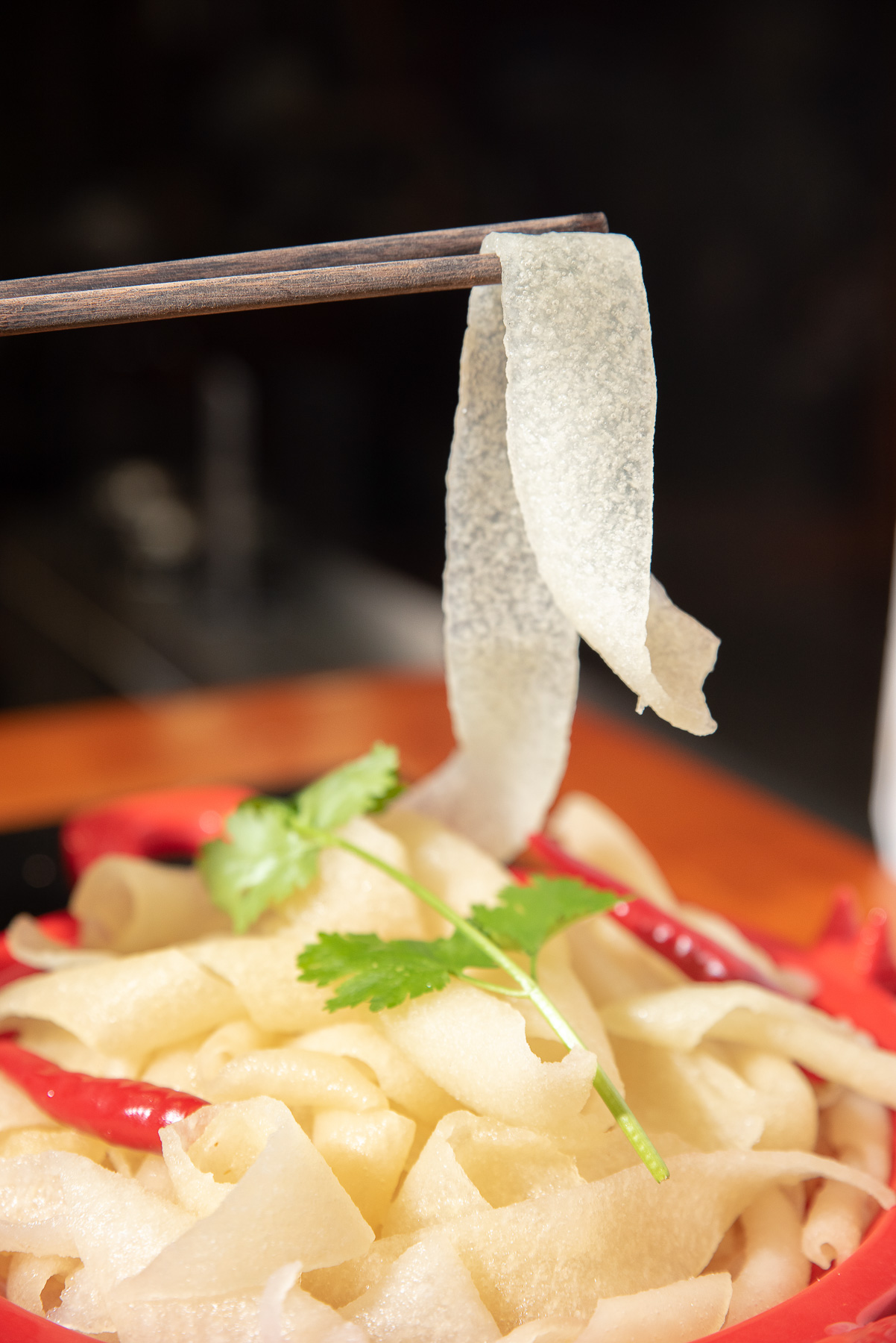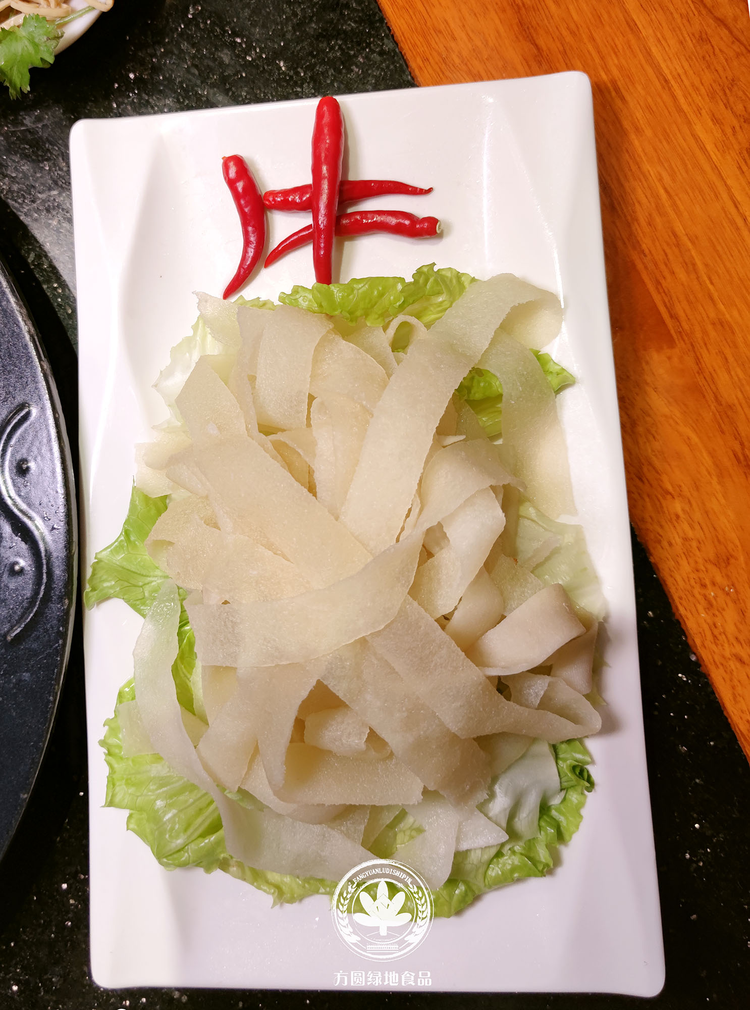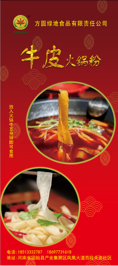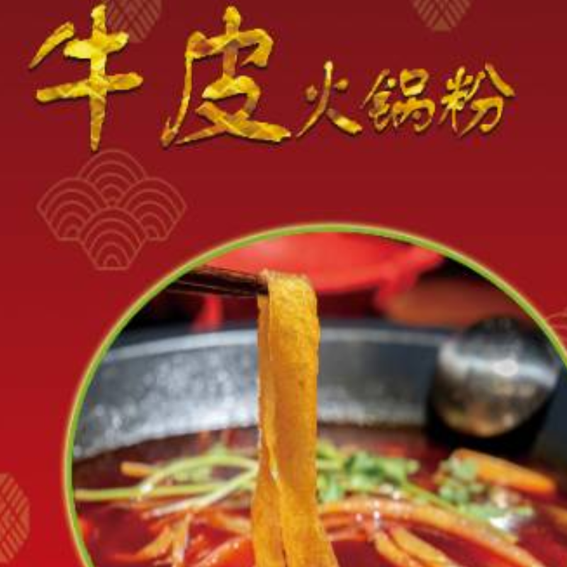 牛皮松花皮肚火锅粉:是以洁净的黄牛皮为原料,分别经过去脂、片皮、切条、凉晒等二十多道传统的古法工序结合现代食品技术精制而成,使之营养丰富,风味独特,爽脆可口,食之余味无穷。