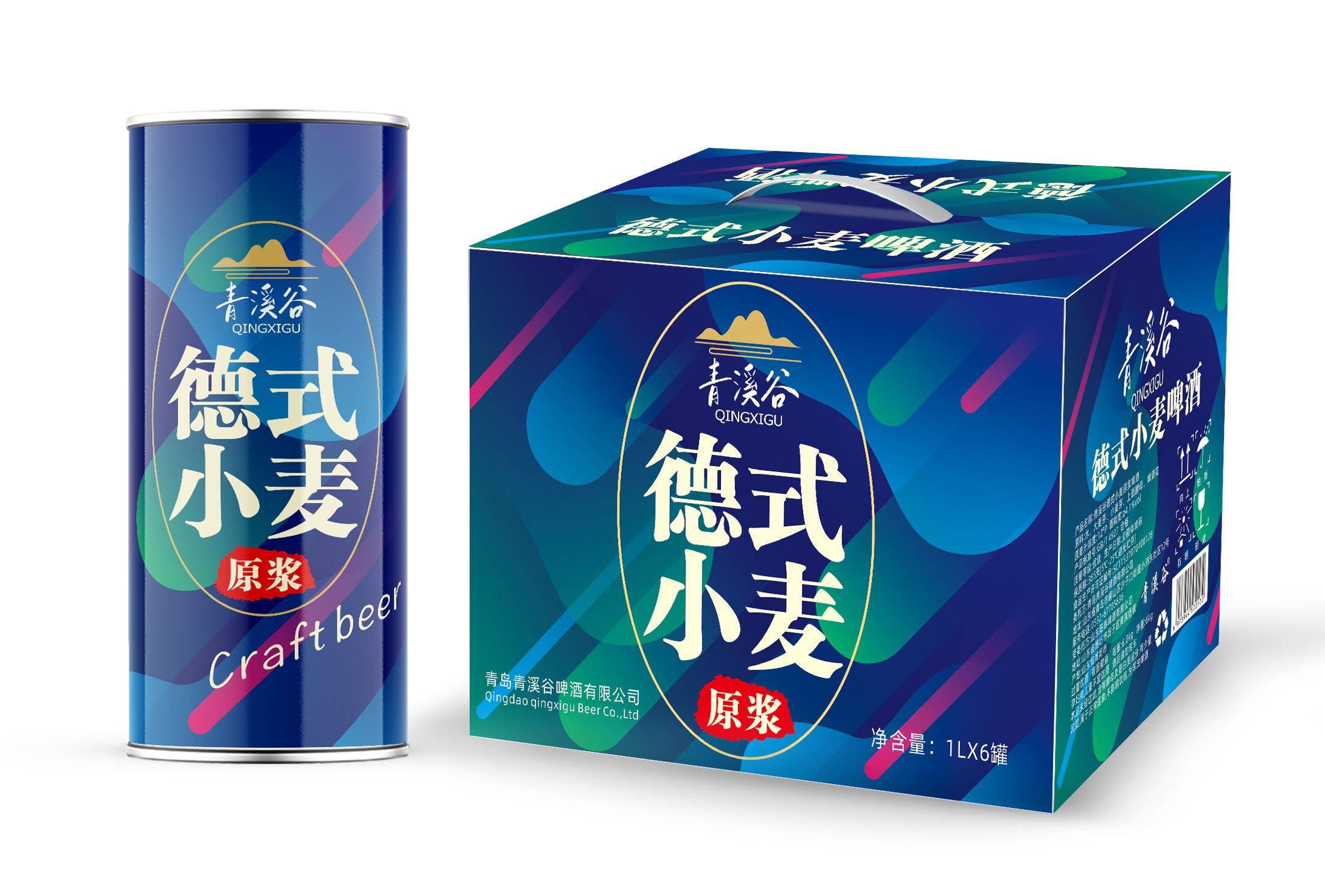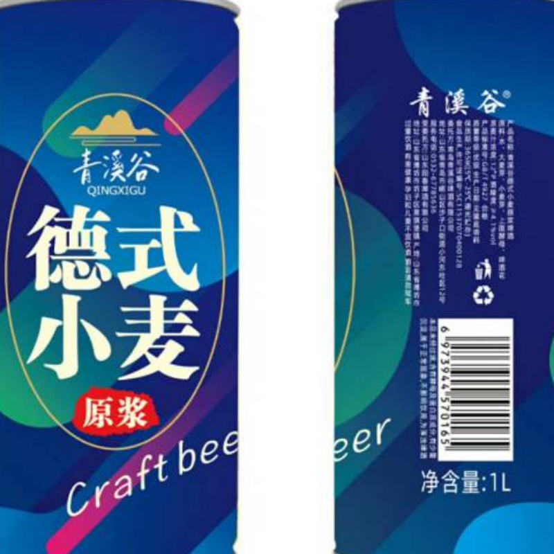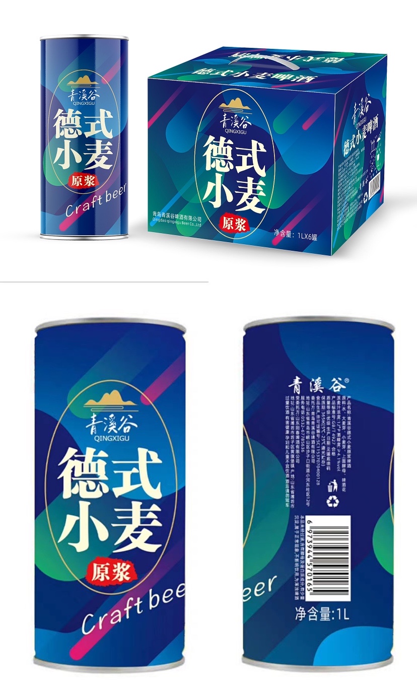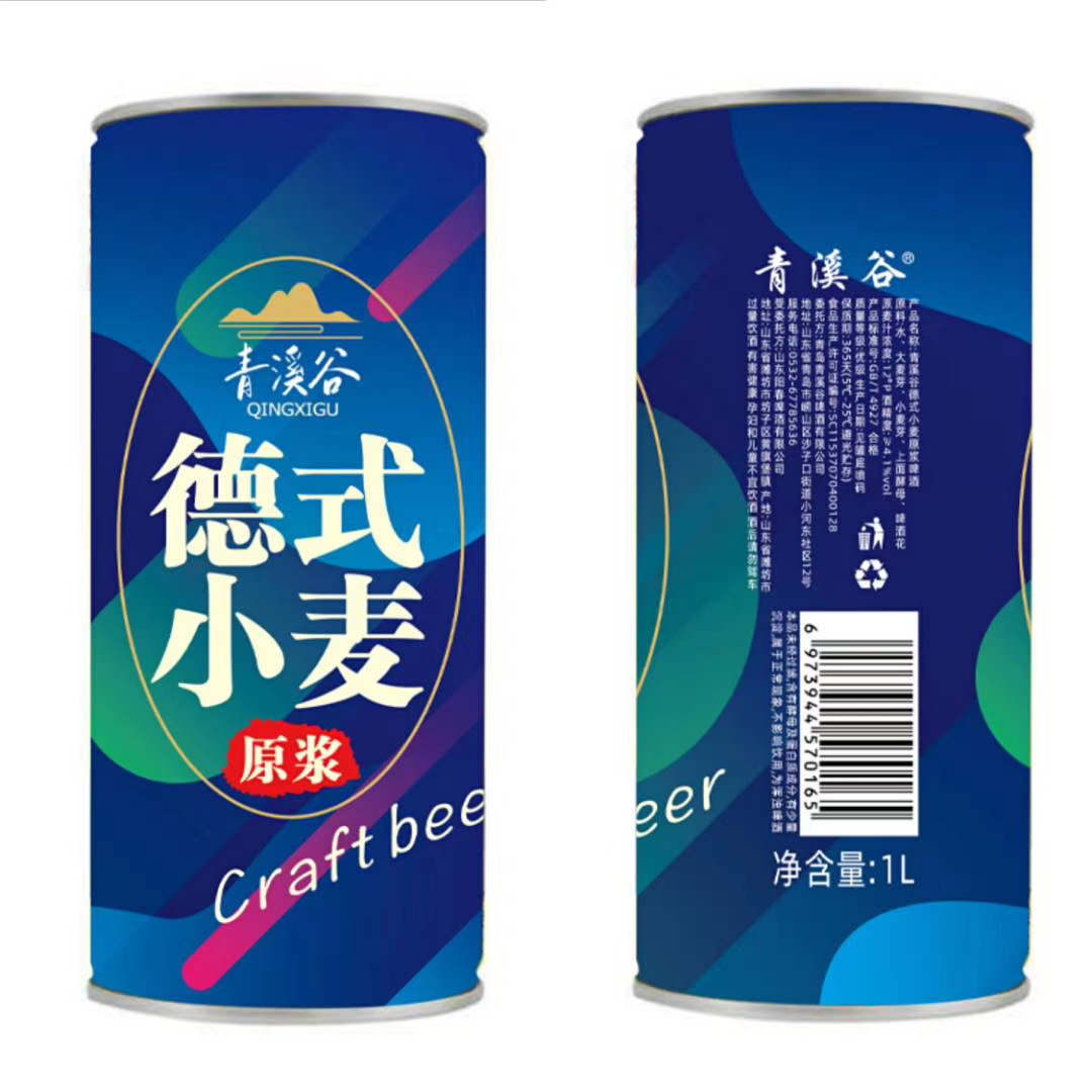 青溪谷德式小麦原浆啤酒:原料采用崂山山脉泉水和进口澳麦、小麦芽、德国酵母、德国索菲亚啤酒花等,原麦汁浓度 12°P,酒精度 4.1%vol, 1L*6听,质量等级为国标优级,保质期12个月。
