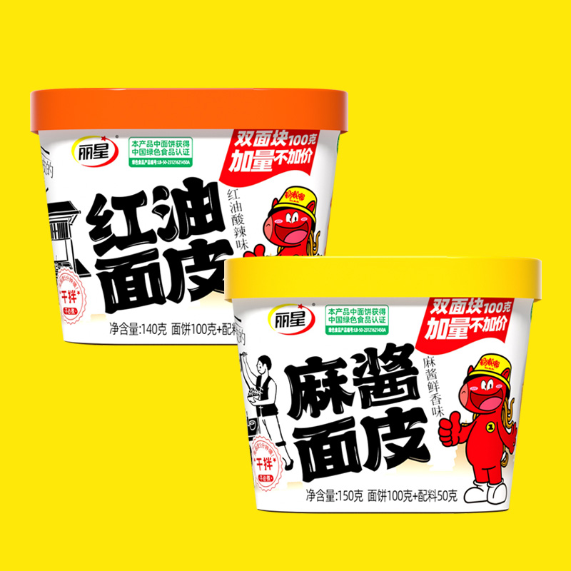 丽星红油面皮、麻酱面皮,创新桶形、简约包装,红油满溢、麻酱鲜香,把辣、香、鲜、爽完美结合,丽星匠心、自然好味!
