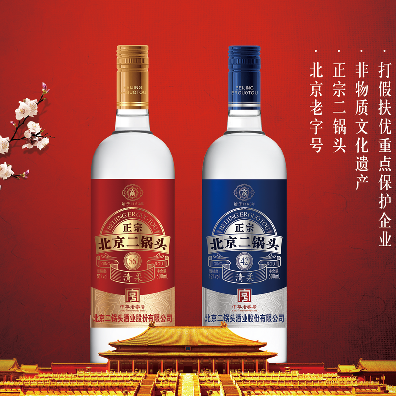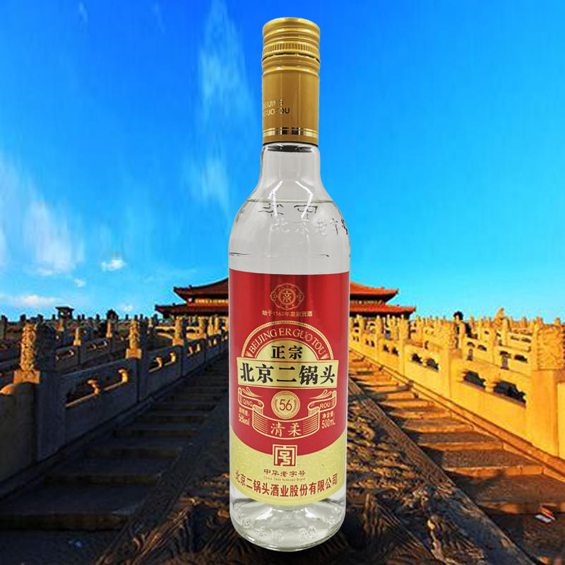 京牌北京二锅头清柔包装设计独特,产品以优质的高粱、小麦、水为原料酿造而成;