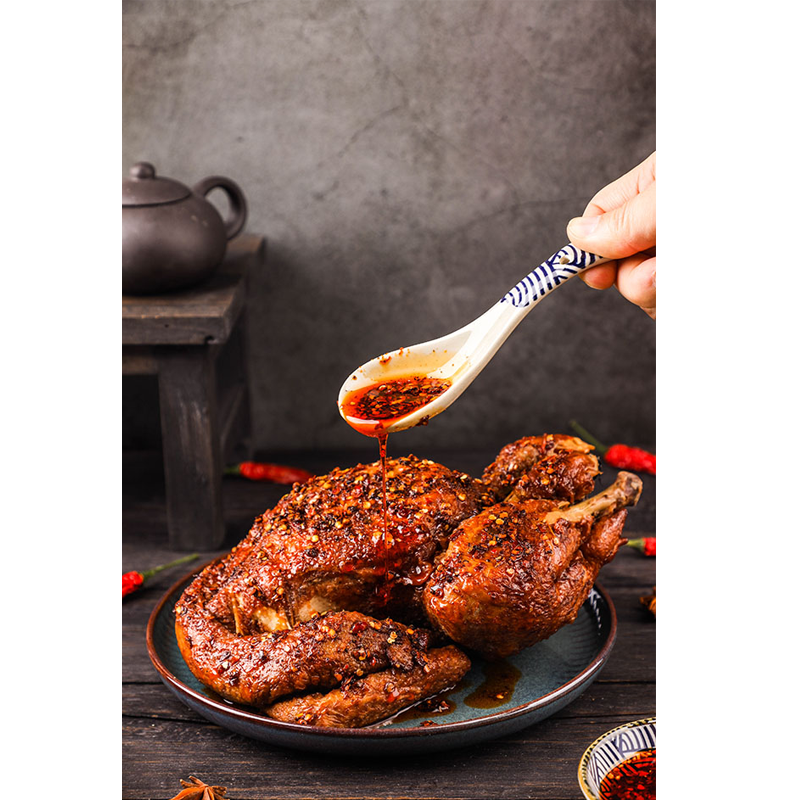 在原有吃鸡的基础上研发出新吃法,每只鸡的包装加装一袋麻油。撕下一块鸡肉,醮一醮麻油,满口爆浆,越吃越带劲。