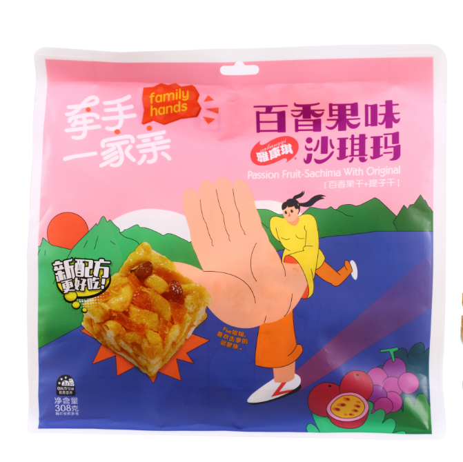 雅康琪牵手一家亲系列308g*12袋沙琪玛有三个口味,分别是百香果味沙琪玛/黑糖坚果沙琪玛/蛋酥芝士味沙琪玛。每袋约22个,独立小包装,随时来一个。沙琪玛制作从原材料严格把控产品质量合理配比,百香果干,南瓜籽仁,提子干,芝麻,鸡蛋,小麦粉,白砂糖,芝士等食材匠心烘焙,继承传统制作工艺,营养美味,酥软香甜,新配方,口感更美味。牵手一家亲系列采用立式包装袋,外观主要突出一家人相亲相爱。