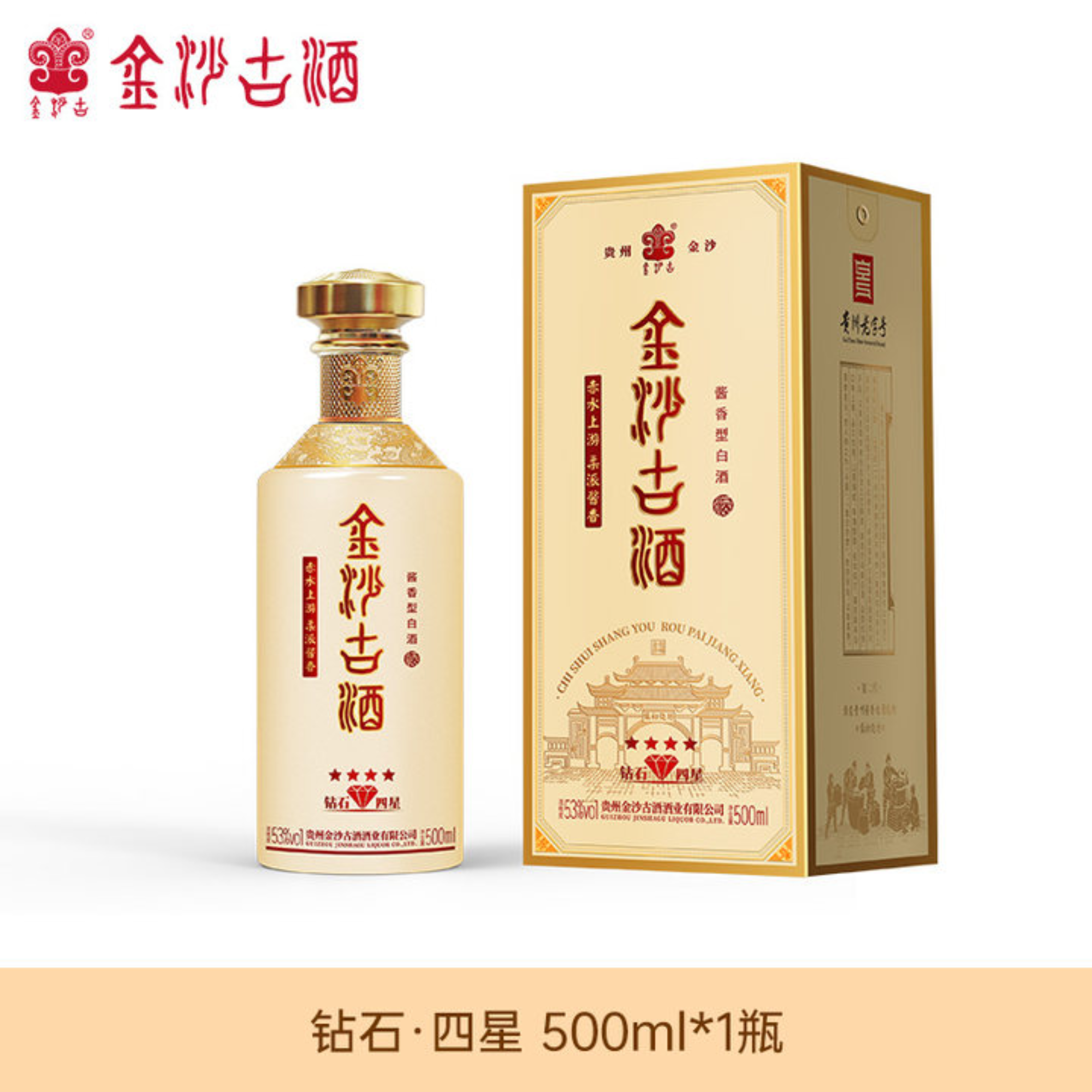 金沙古酒(钻石四星)。产品定位为战略形象中端主导产品。瓶身以纯净典雅米色为主基调,选用金沙古酒基础年份酒体,精心勾调而成。酒体透明,酱香明显,幽雅细腻,酒体醇柔,回味悠长,空杯留香持久。