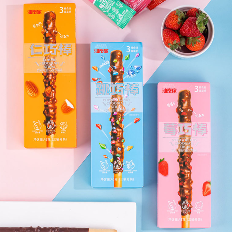 该系列有三个单品:跳巧棒、莓巧棒、仁巧棒