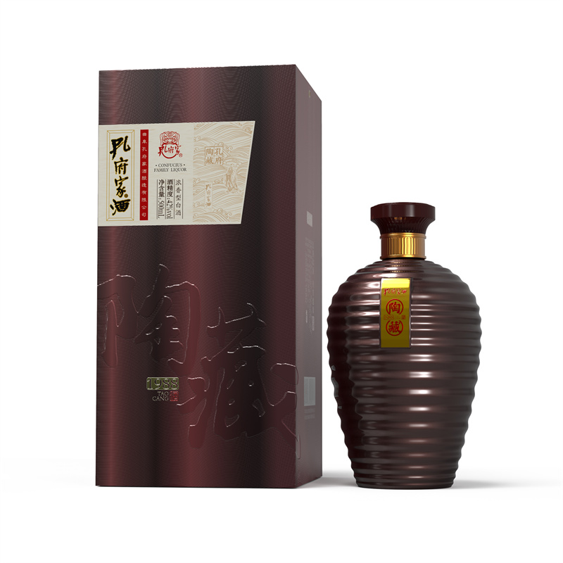 陶系列包含陶藏1988与陶藏1992,采用30年老窖池120天双轮发酵,陶缸多年储存,酒体绵柔净爽。瓶身传承孔府家大陶经典器型,融合儒家文化,高贵典雅,瓶身增加水纹设计,更具律动美;盒身手绘意境插画取自《孔子圣迹图-在川观水》,生动演绎儒家文化。
