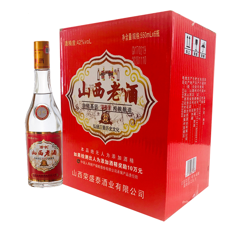 本款酒为“山西老酒”系列产品,酒质精良,经典20纯粮酿造。以水、高粱、大麦、豌豆等为配料的清香型白酒,执行GB/T10781.2标准,酒精度为42%Vol,净含量为550ml。
