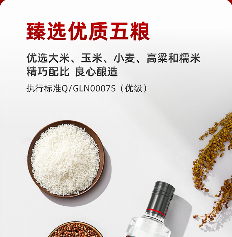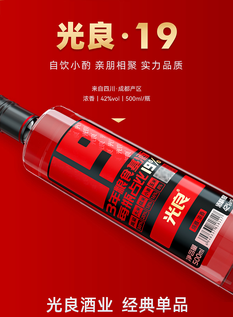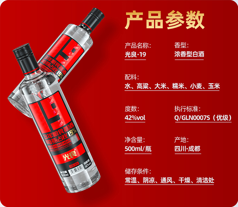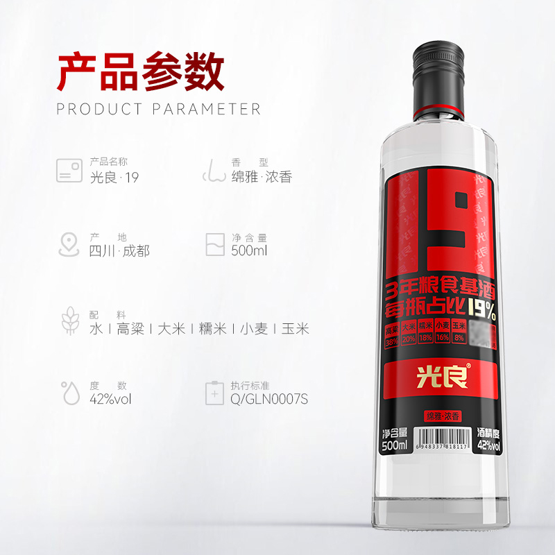 42度浓香型白酒,内含19%三年粮食基酒#彪悍的性价比#纯粮酿造,良心配置好喝快醒。不口干 纯净平衡,浓香清冽纯粮原酒搭配山泉水口味不涩不腻,清爽不粘口亲民价格,性价比超高,自饮荣获2019 德国红点设计奖
