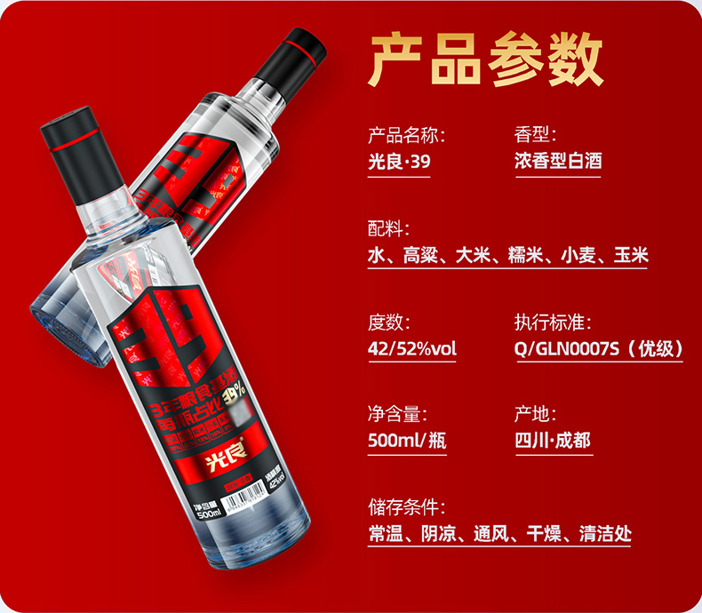 42度/52度浓香型白酒,内含39%三年粮食基酒#小聚的心头爱#纯粮酿造,口感醇厚 绵柔香甜,浓香甘冽纯粮原酒搭配山泉水口味不涩不腻,极具舒适感荣获:2021 旧金山世界烈酒大赛(SFWSC) 金奖2021 法国国际烈酒大奖赛(FISA)银奖 2020、2021两届蝉联国际葡萄酒暨烈酒大赛(IWSC)铜奖2020 中国酒业青云奖 年度新锐产品