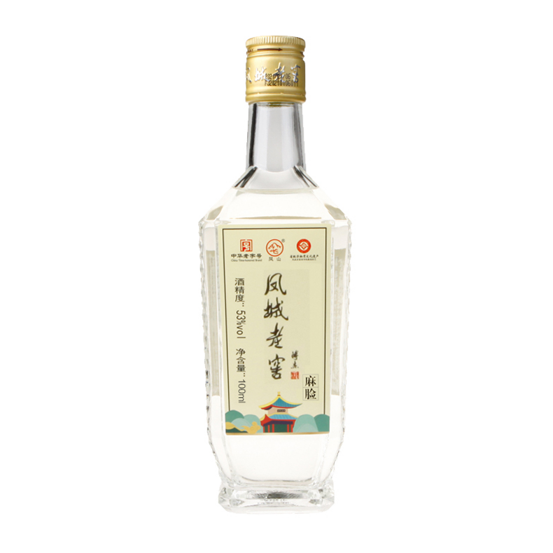 53度,100ml/瓶,小包装,独特的造型,酱香型,酒体微黄透明,入口绵纯,后味无穷,一杯品尽人生百味,凤城老窖两代人的记忆,方瓶文化的代表,也是我们老麻脸的延续。