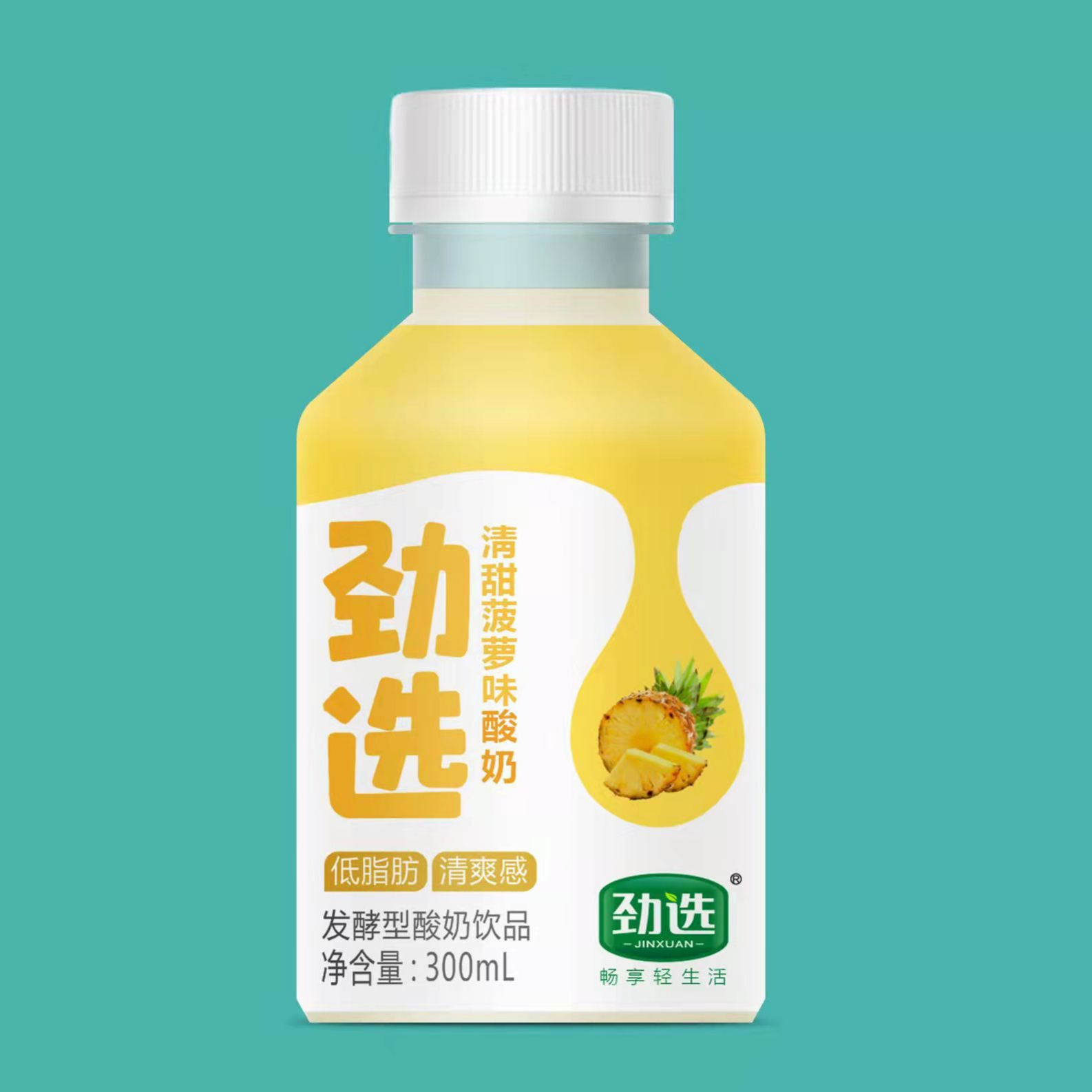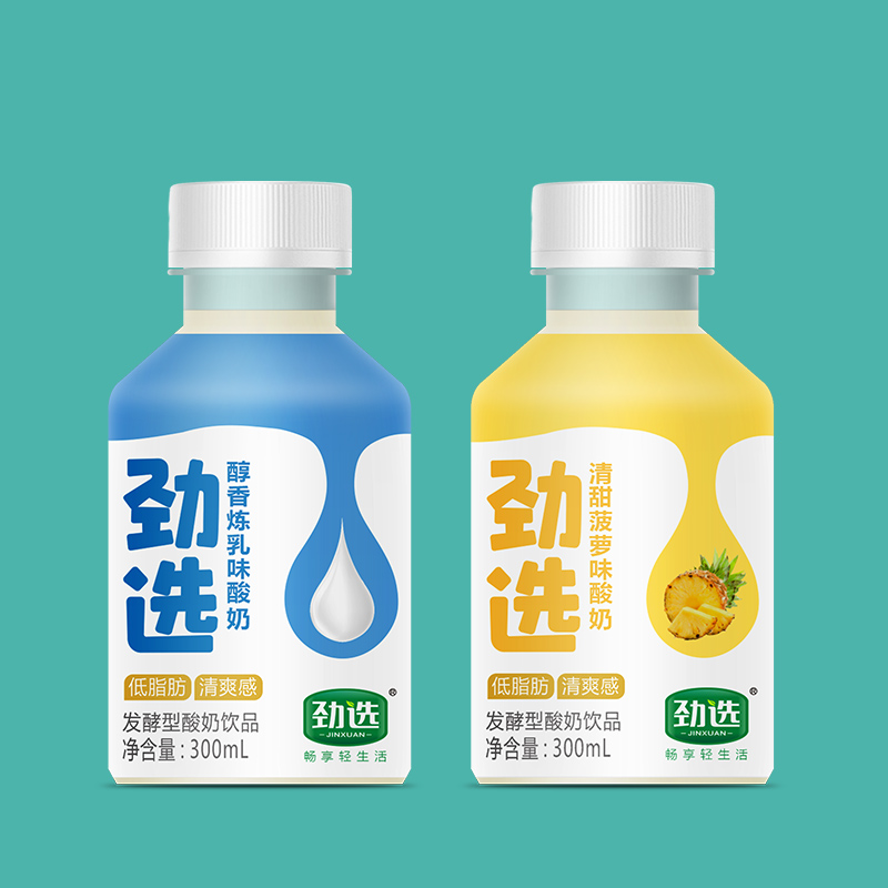 本款产品是劲选菠萝味酸奶300ml系列,是一款针对青少年儿童打造的一款酸奶饮品,适合不同年龄段的消费者,是目前市场上具有引领的一款“清甜菠萝”味酸奶产品。
