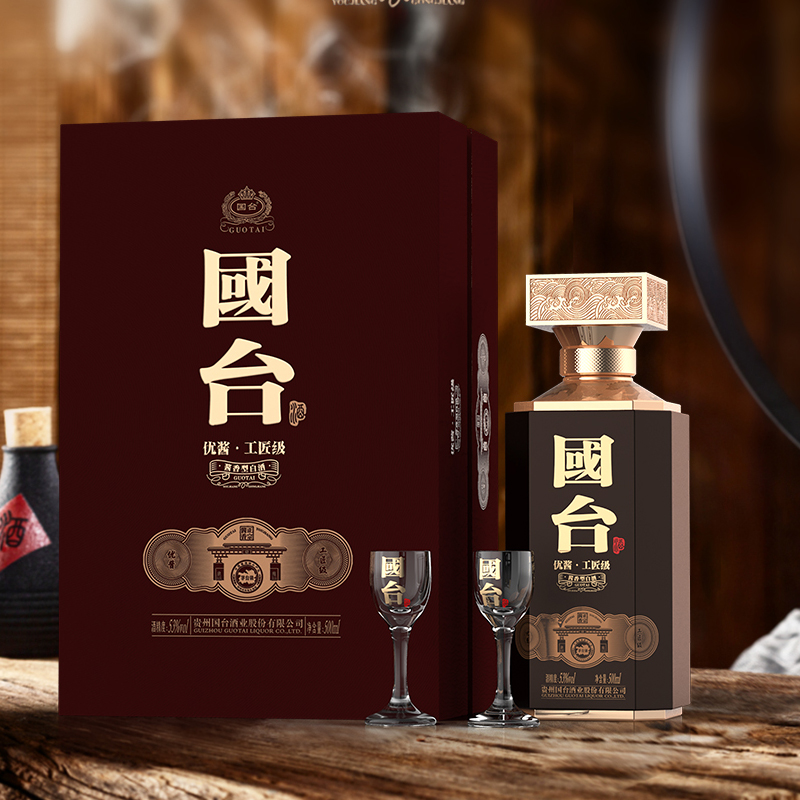 国台“优酱·工匠级沉稳厚重,品质无需赘言,年份贮存,气宇轩扬间。不露,也锋芒,是一款具有收藏和品鉴价值的珍藏级酱香型酒品。深咖色瓶身饱满厚重,造型“既工盘礴,又富收藏”,傲视气概一览无余。外不张扬,内富其涵,内外兼修,简约而不简单。“纯粮固态 大曲酱香 曲为酒骨 粮为酒本”淬炼出了国台“优酱·工匠级”酱香显著、绵柔醇和、幽雅细腻、回味悠长、空杯留香之特点。喝酒,喝健康,喝好酒,喝国台。