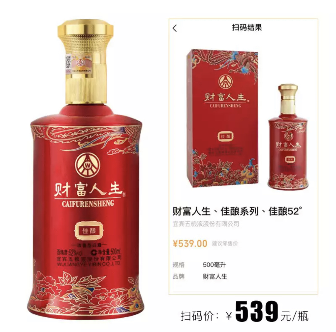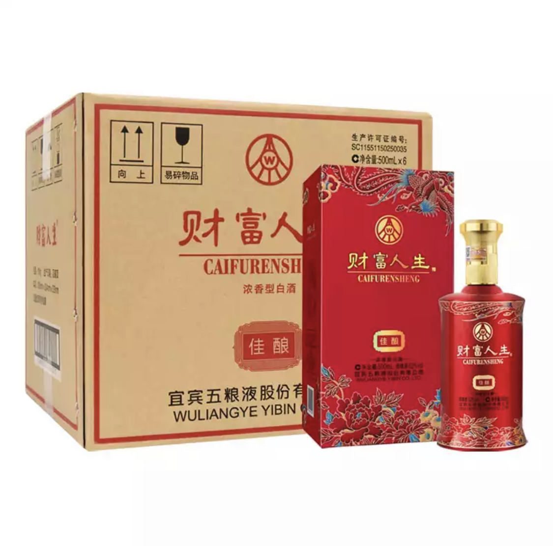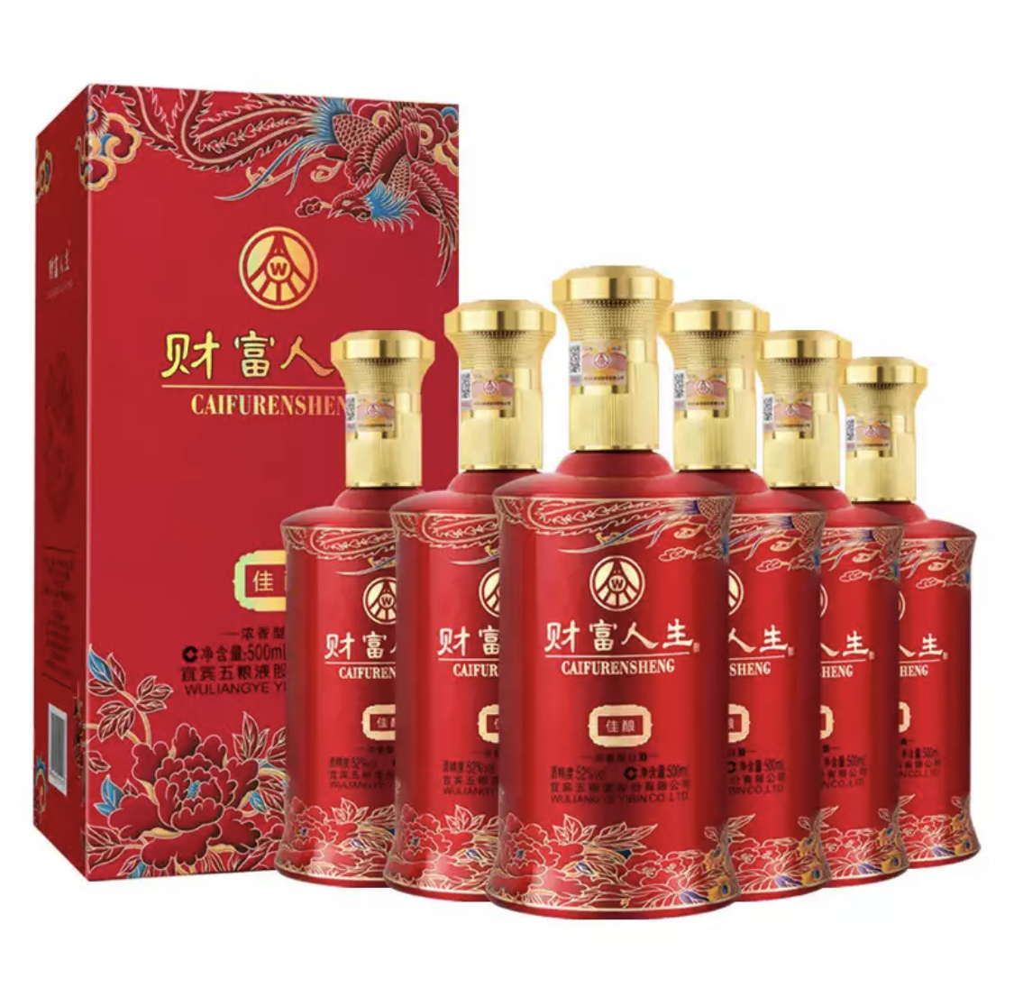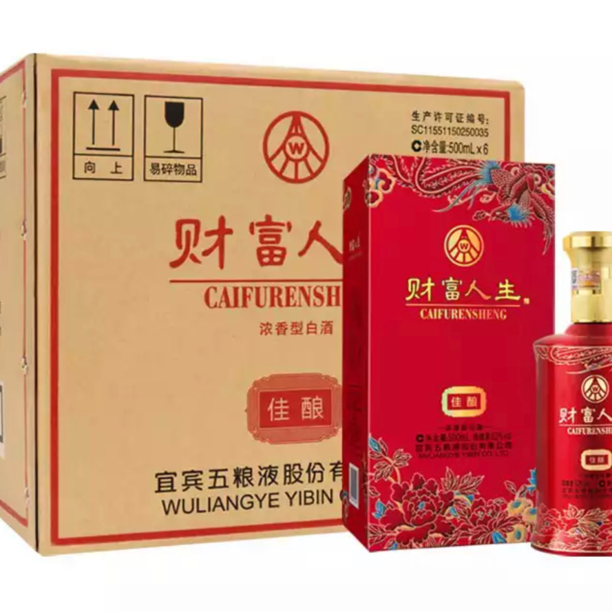 财富人生佳酿外盒图案上面是凤舞九天下面是花开富贵两种富有吉祥幸福寓意的外盒和红色瓶身组成,是商务接待、婚宴、寿宴、家庭宴请、朋友聚会的**产品。