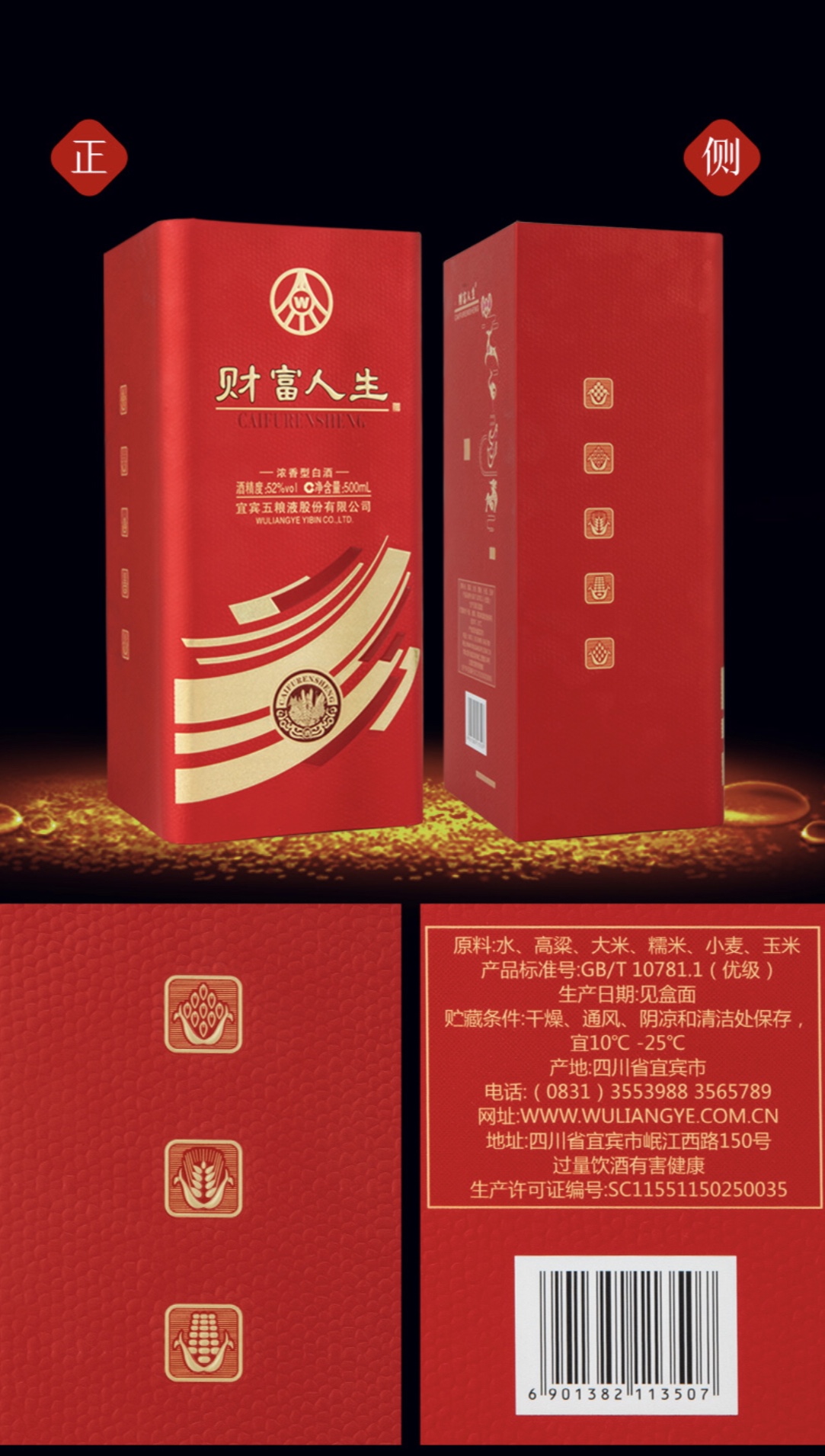 财富人生醇酿外盒红色压纹仿皮半手工盒和红色的瓶子和象征财富之路的图案合而成的;是商务接待、婚宴、寿宴、家庭宴请、朋友聚会的**产品。
