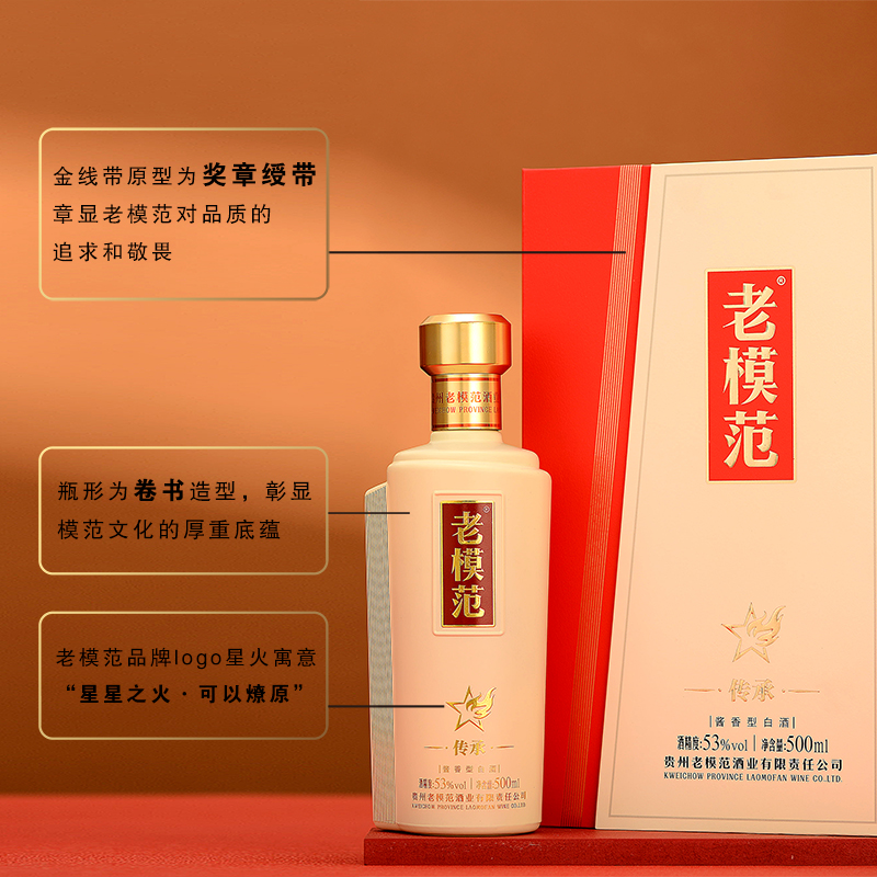 瓶身为卷书变形,我们也亲切的称呼其为卷书瓶;体现了中国传统文化的古典优雅美学以及内涵美学,创造了商务宴请和送礼低调有内涵寓意的场景,成就了老模范品牌瓶身经典符号;提高了品牌的记忆与传播方式;使之在瓶身上就有说不完的文化故事。
