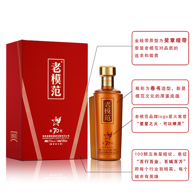 瓶身为卷书变形,我们也亲切的称呼其为卷书瓶;体现了中国传统文化的古典优雅美学以及内涵美学,创造了商务宴请和送礼低调有内涵寓意的场景,成就了老模范品牌瓶身经典符号;提高了品牌的记忆与传播方式。