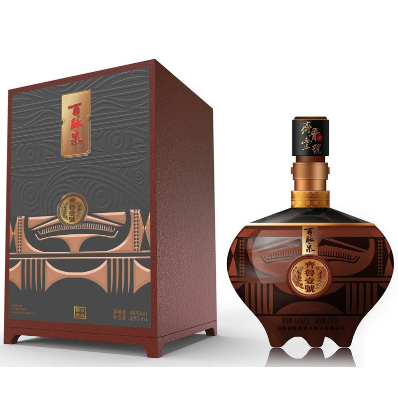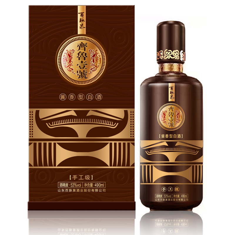 (2)酱香型齐鲁壹号,龙山文化元素点缀,整体优雅,深棕古朴,精致纹饰,轻奢酱香味道,小口香,大口柔, 不爆、不辣、不挂喉!