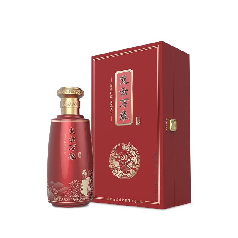 瓶身通体满施红釉,其灵感源自赤水河流域的丹霞地貌,红色瓶身色彩纯正,喜庆端庄、富贵典雅,亦含蓄亦奔放,是中华民族**文化内涵的经典之色。金色祥云融于潺潺河水,明耀辉煌,传递出“超凡脱俗,集大成者”的设计内涵。