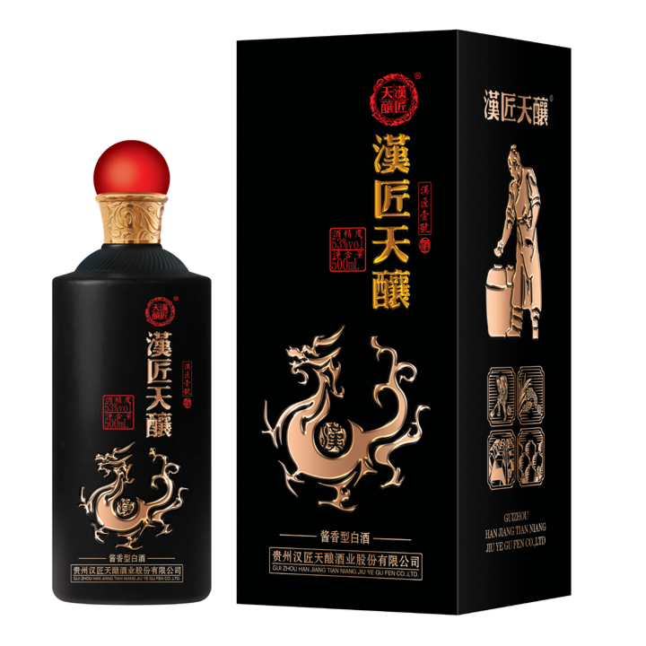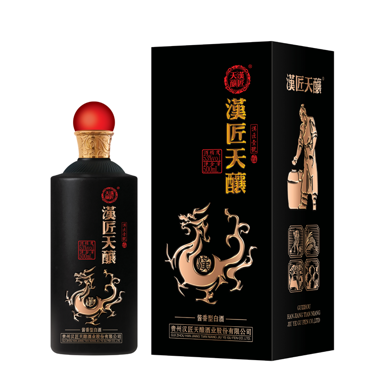 产品介绍: 漢匠天酿酒(漢匠壹號)产于中国贵州省仁怀市茅台镇,以本地优质高粱、小麦、水为原料。利用得天独后的自然环境,采用科学独特的传统工艺精心酿制而成,具有清亮透明、酱香突出、香气优雅、空杯留香持久、酒体醇厚、丰满协调、回味悠长的典型风格。