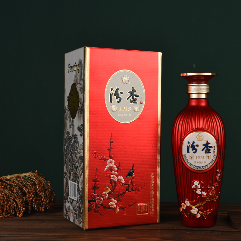 产品历经多次造型调整后定型为“梅瓶”造型——瓶体修长、小口短颈、丰肩瘦底、圈足的瓶式,以口小只能斟酒插梅枝而得名。梅瓶*早出现于唐代,流行于宋辽。外观设计经现代视觉重塑后去繁就简,不但考虑到贮酒容量,还要注意造型优美,可谓讲究之极,其造型挺秀、俏丽。其造型既是酒器,又是一件令人爱不释手的观赏品。瓶身之上,杏花村汾式元素贯穿其间,整体端庄华贵,亮丽华贵,与众不同,吉祥富贵尽显清香品质,令酒中有画,画中有酒,匠心独运,妙趣横生。整个包装的色调、瓶型以红金色为主色调,象征喜庆和吉祥,瓶身与包装达到手感与视觉的高度协调。该款产品精致有品位,既大方又经济实惠,既可满足亲朋相聚、商务应酬,又可作为自用酒的**。