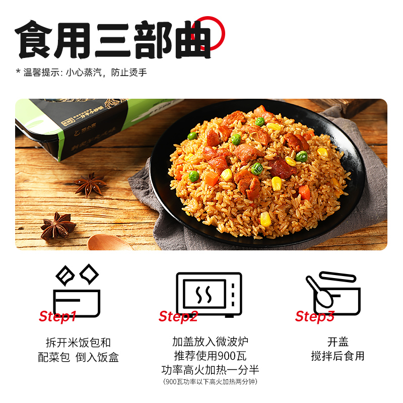 范小宴微波炒饭,微波一分半即可食用;