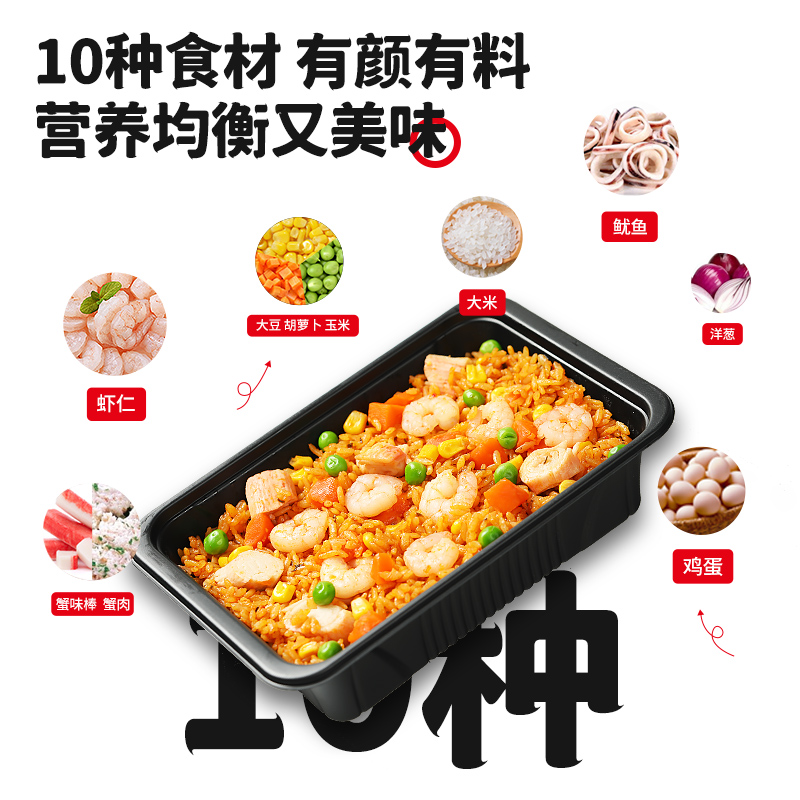共四个口味:黑椒嫩牛荞麦炒饭、咖喱鸡肉荞麦炒饭、新奥尔良风味鸡块炒饭、西班牙风味海鲜炒饭