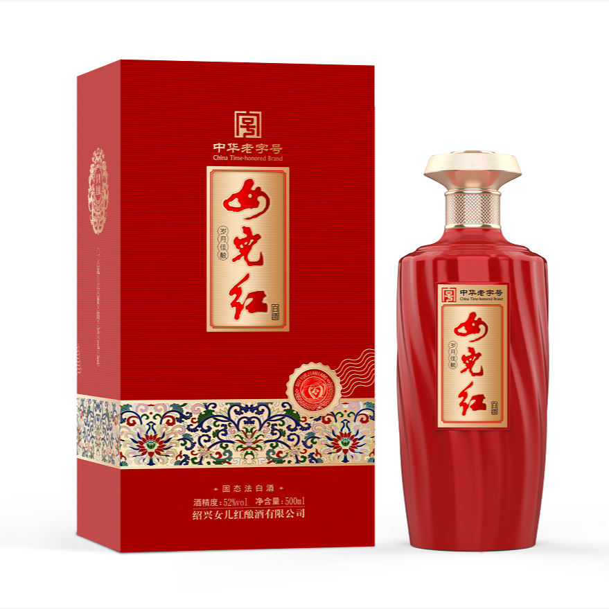 女儿红白酒.岁月佳酿 外包装采用精致的卡盒工艺,搭配盒身金线浮雕设计, 喷涂红色外瓶,烫金标识 固态法白酒工艺标识在盒身正面代表纯粮酿造