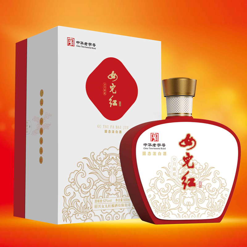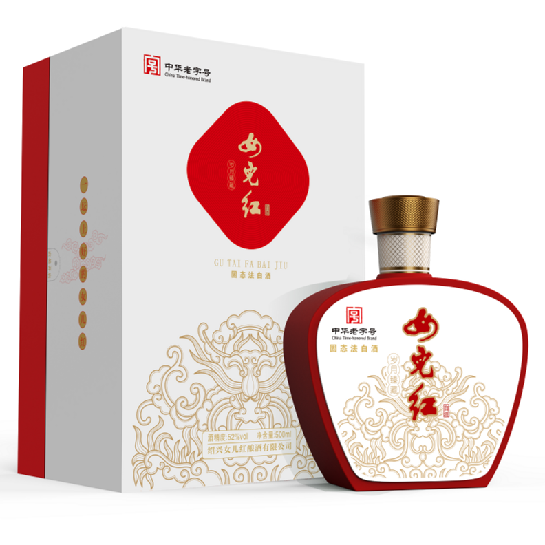 女儿红白酒.岁月臻藏外包装采用木盒材质 精致的天地盖包装,盒身整体采用米色特种纸 整体色调温和 高贵,正面烫金祥云龙纹 ,瓶身采用高档双色喷涂,立体感更强,彰显高档的品质。