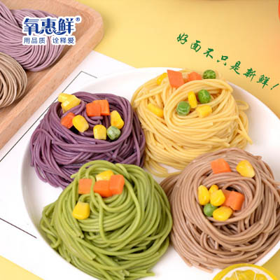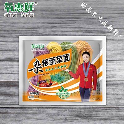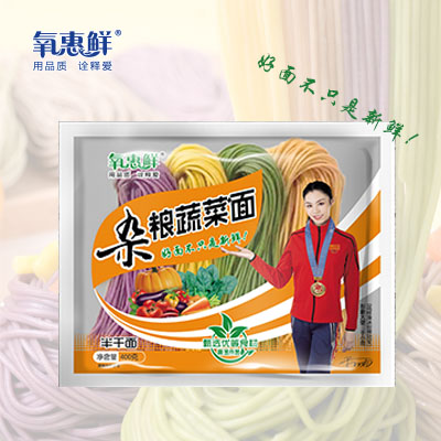 氧惠鲜杂粮蔬菜面由紫薯面,南瓜面,菠菜面,胡萝卜面4种蔬菜面组合,多重营养为您的健康保驾护航。