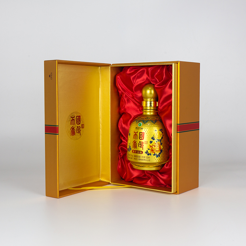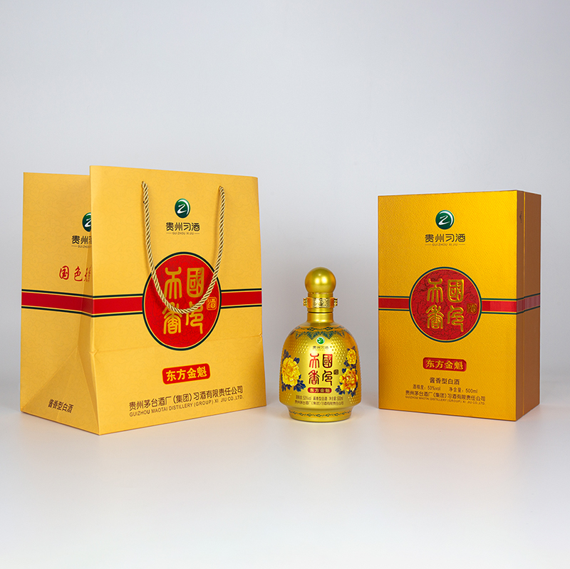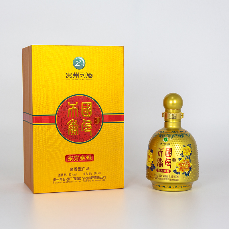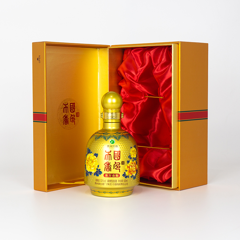 国色天香.东方金魁;东方金魁的包装,通体采用金色,瓶子仿古代官帽设计,瓶身上的金色牡丹,高雅大气,包装整体协调统一,酒体色泽晶亮透明,酱香明显,空杯留香持久,口感醇和丰满。
