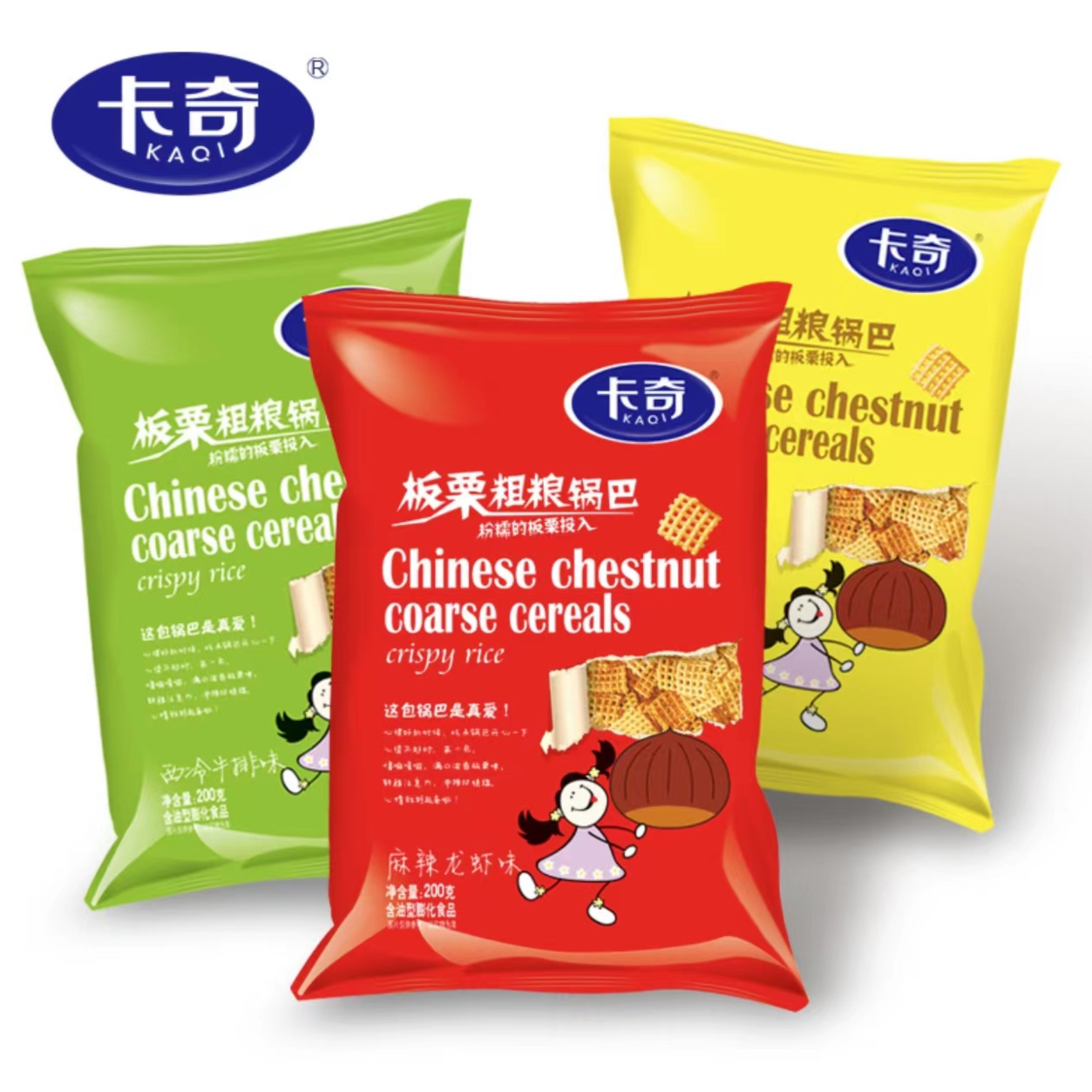 产品原料特点:在传统蒸煮锅巴基础上,添加坚果板栗,让锅巴口感更糯香。也提高产品的营养。