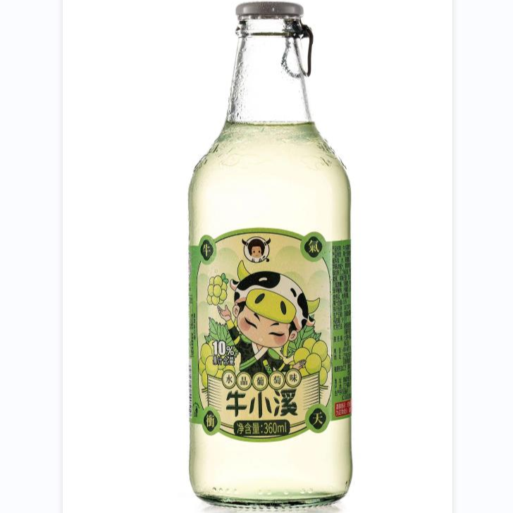 国风潮饮——牛小溪汽水,采用现代新工艺,口感直爽,果汁含量10%,有大白梨、凤梨、橙汁、水晶葡萄、荔枝、樱花水蜜桃六个口味;在包装上,牛小溪采用玻璃瓶瓶装、PVC材质包装,满足不同消费需求,规格多元化;在品牌设计上,采用了“小清新色调”,搭配年轻人喜欢的卡通人物,让消费者眼前一亮,符合当下Z时代审美和生活态度,在年轻人心目中产生灵魂的共鸣,让消费者发自内心的喜爱。