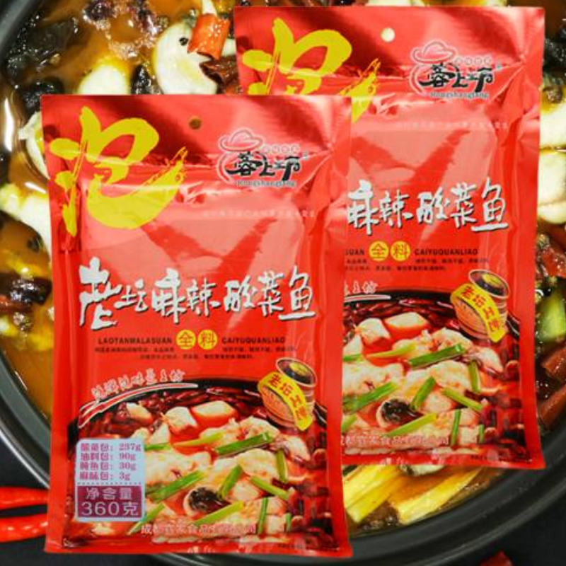 蓉上坊360g麻辣鱼调料是做四川水煮鱼的专用佳品:老坛酸菜、酸爽可口;汤料辣味自调、汤香味美;腌鱼料鲜嫩去腥、汤汁浓稠;四川特产花椒,麻味浓烈、舌尖上的舞蹈!